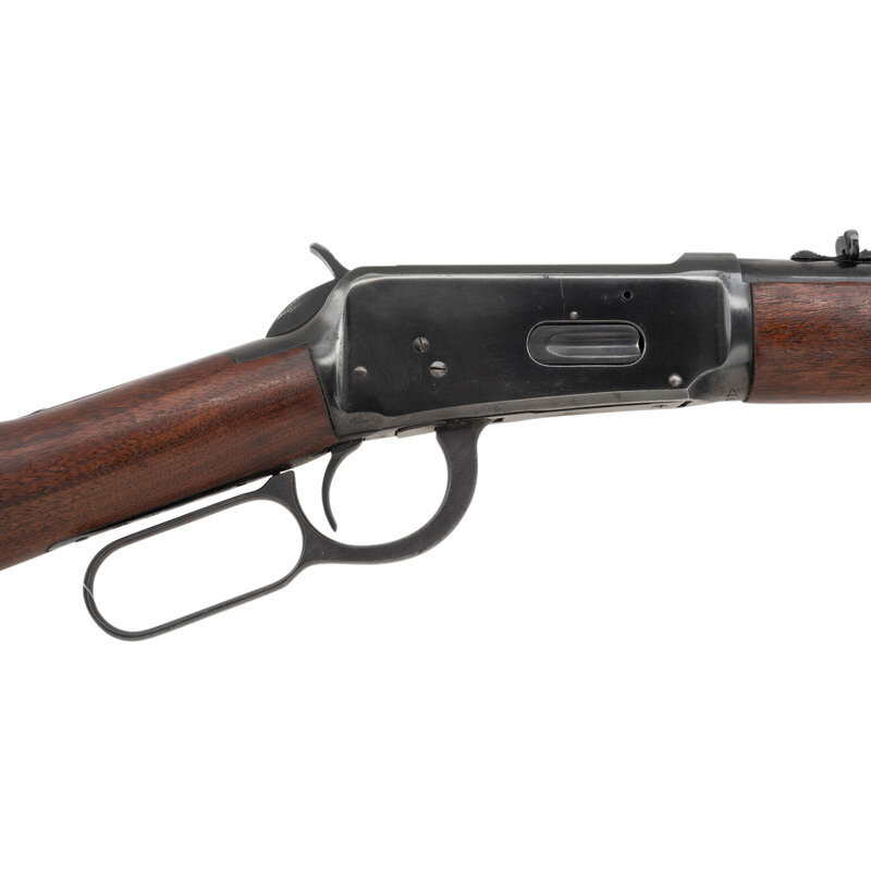 .30-30. 20" barrel length. SN: 2167675. Blued metal finish with walnut straight wrist stock featuring half length handguard and shotgun style butt. Lever action repeating rifle fed by a full length tube magazine with adjustable semi-buckhorn rear notch and fully hooded front bead sights. Standard make and model markings, including MODEL 94 to left barrel. {C&R}