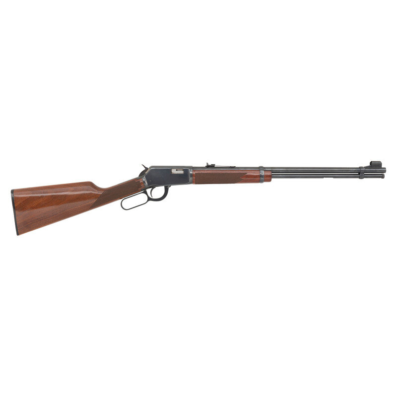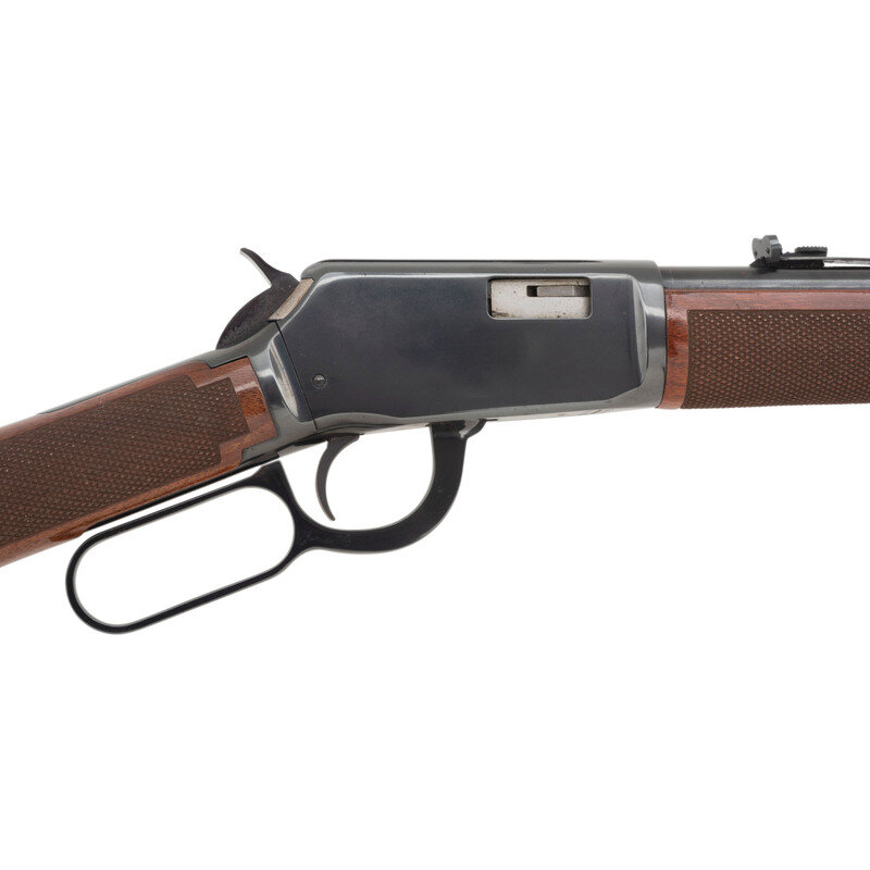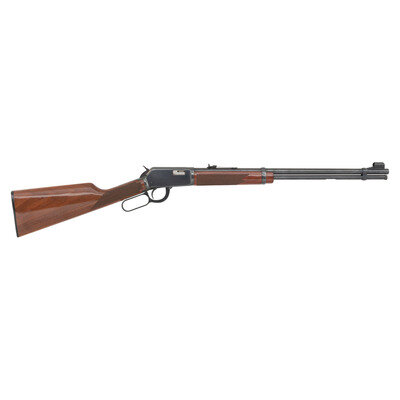 .22lr. 20.25" barrel length. SN: F466037. Blued metal finish with checkered straight stock with checkered plastic buttpad and checkered forend mounting adjustable semi buckhorn rear sight and hooded front bead. Lever action repeating rifle charged by tubular magazine. Features standard make and model markings. {MODERN}