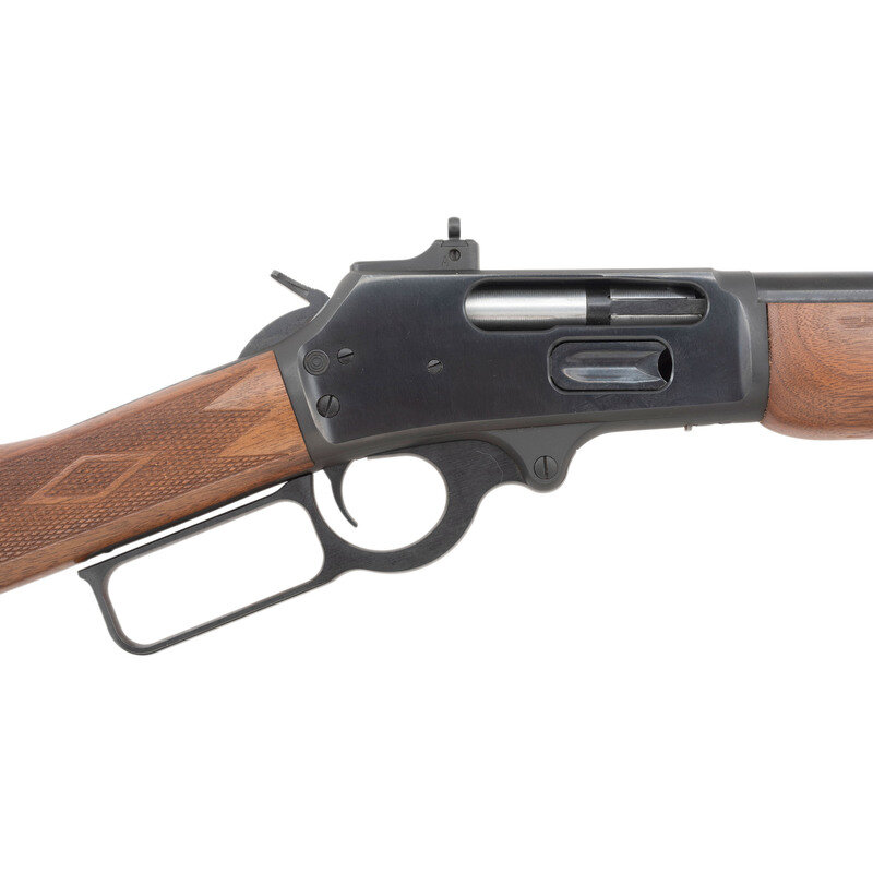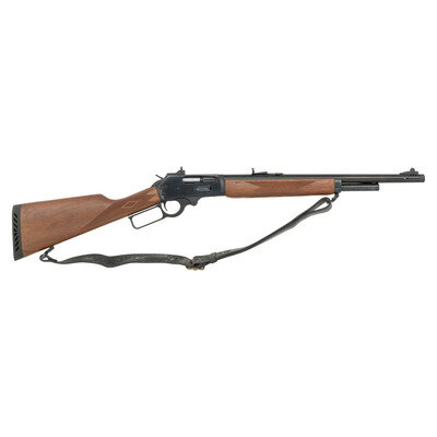 .45-70. 18" barrel length. SN: 01017312. Blued metal finish with polished bolt in walnut straight wrist stock with black rubber recoil pad and ported muzzle. Lever action repeating rifle fed by a tube magazine mounting adjustable semi-buckhorn rear notch, front blade, and ghost ring rear sights. Comes with a black leather GALCO sling. Standard make and model markings. {FFL}