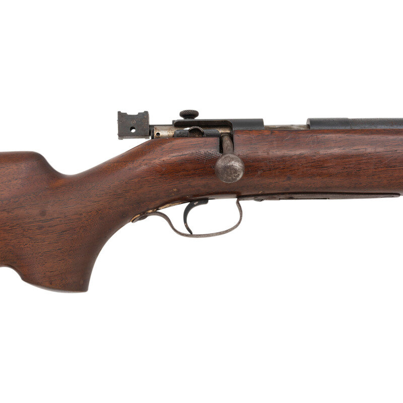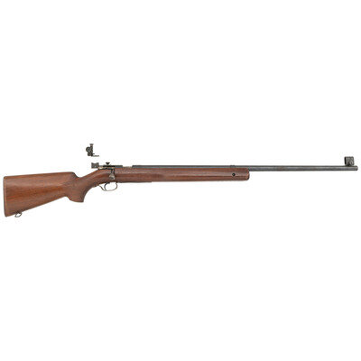 .22 LR. 24" barrel length. SN: 893. Blued metal finish with polished bolt in walnut semi-pistol grip stock with checkered steel buttplate and mounting tunnel front sight, and rear aperture sights. Bolt-action repeating rifle fed by absent single-stack detachable magazine. Standard make and model markings. Item is missing the retaining screw for the rear sight, and lacks a magazine. Barrel drilled and tapped for mounting Unertl style scope bases. {C&R}