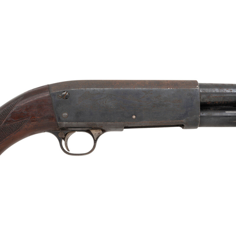 20 Gauge. 26" barrel length. SN: 582441. 2.75" chamber length. Improved Cylinder. Blued metal finish with polished bolt mounting walnut semi-pistol grip stock with aftermarket white line spacers and a red bead front sight. Slide action repeating shotgun fed by a tube magazine and featuring a combined loading and ejection port. Receiver is lightly engraved with ducks to the left and pheasants rising on the right. White line spacers do not fit flush, and appear to have been installed and roughly cut down as an aftermarket modification. Checkering to wrist appears unevenly cut, most likely by hand after production. {C&R}