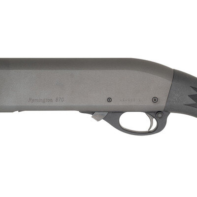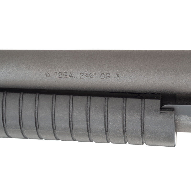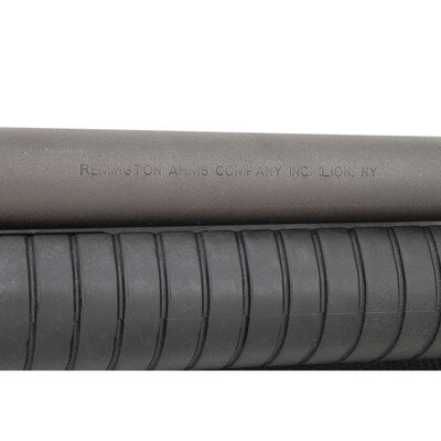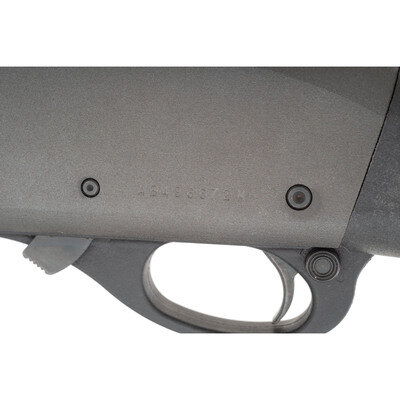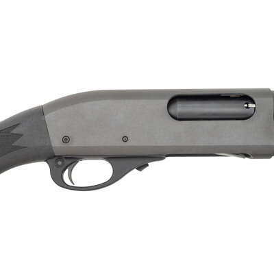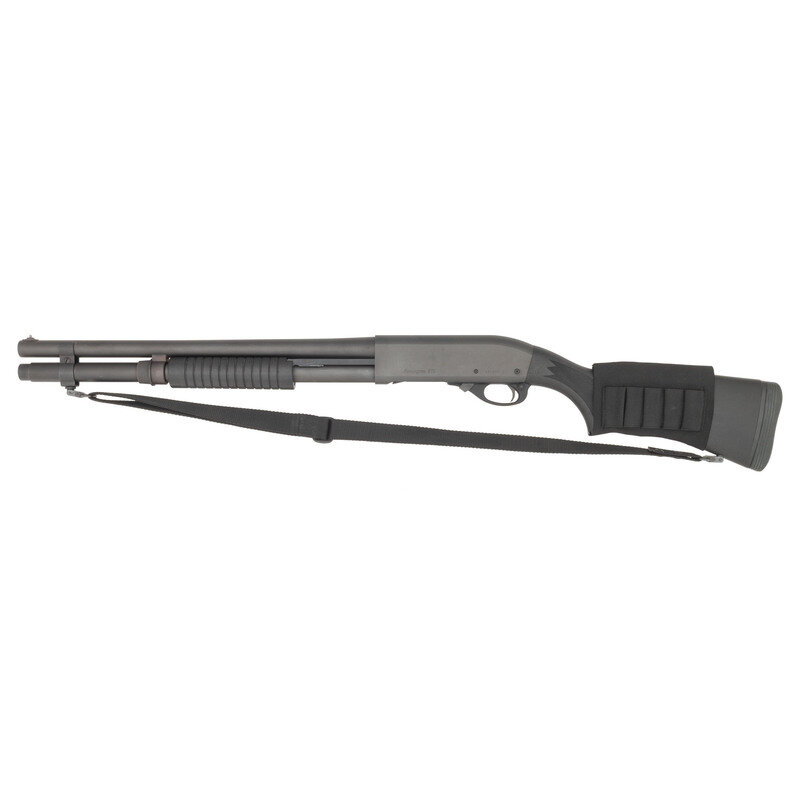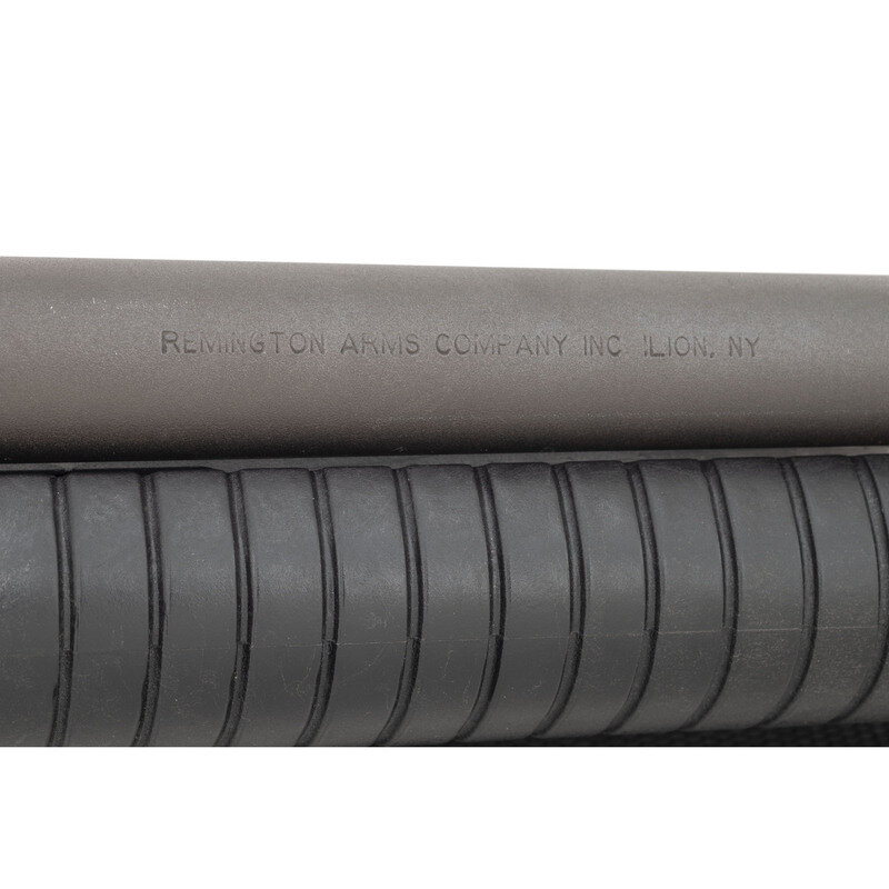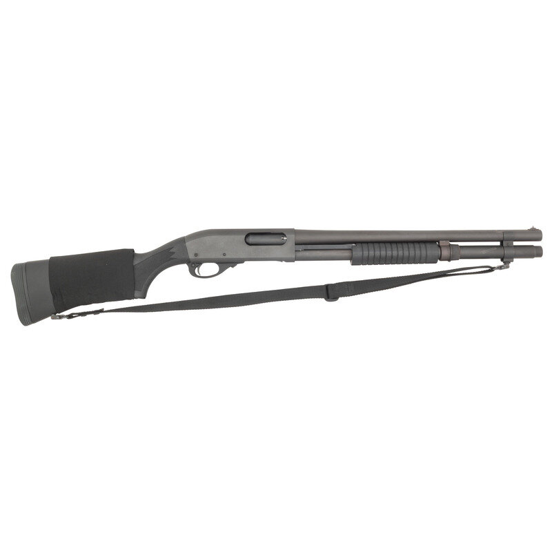 12 Gauge. 18.5" barrel length. SN: AB496672M. Matte black finish overall with black synthetic furniture, nylon sling, and Remington marked recoil pad. Slide action repeating shotgun fed by an internal tube magazine and mounting a front bead sight and a full length magazine tube. Cylinder bore. 3" chamber length. {MODERN}