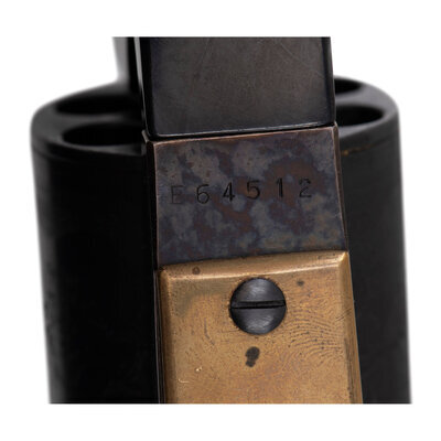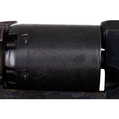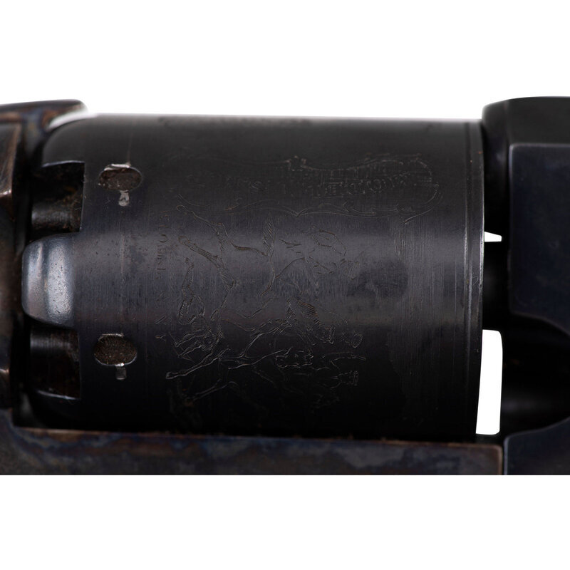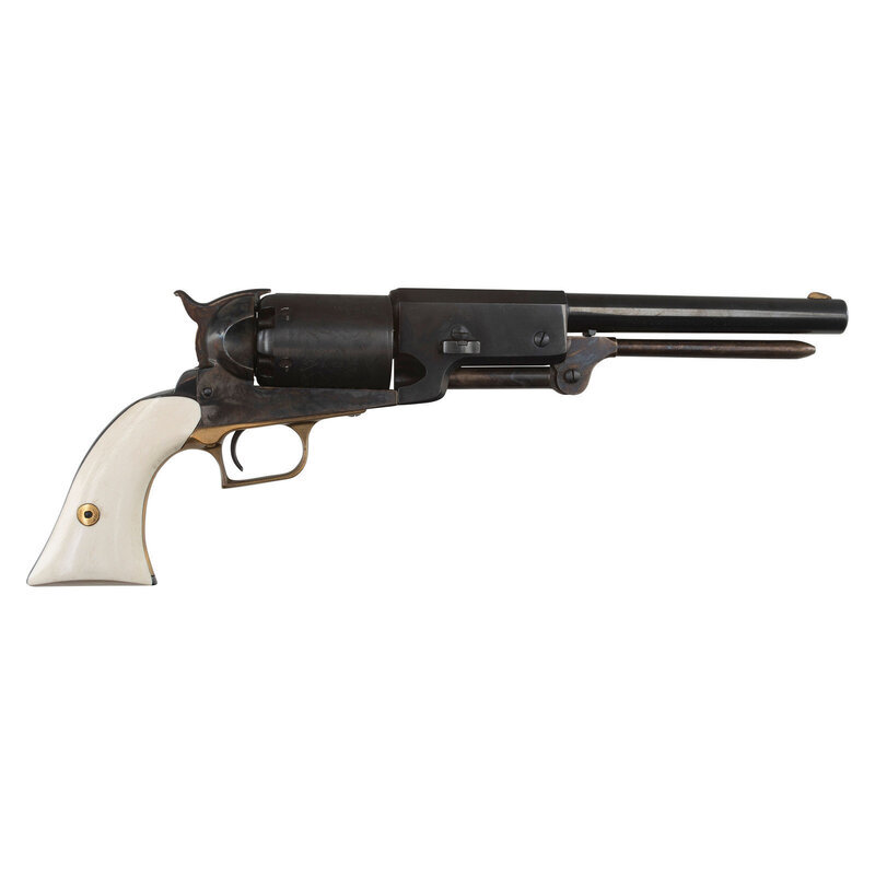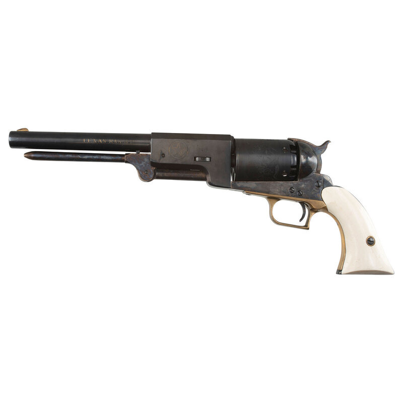 .44 Caliber. 8.75" barrel length. SN: E64512. Blued and Casehardened metal finish with brass triggerguard and mounting imitation Ivory two piece grips. Single-action percussion pistol patterned after the Colt Walker Model 1847 revolver and commemorating the history of the Texas Rangers. The revolver features Ormsby's {Ranger and Indian} scene roll engraved on it, and the round cylinder stops on the radius of the cylinder. The left barrel is marked TEXAS RANGER in gold paint lined letters with a {Star Emblem} on the left barrel flat above the Italian black powder firing proofs. Right barrel has been marked US/1847, with the top flat struck 0012 OF 1000.