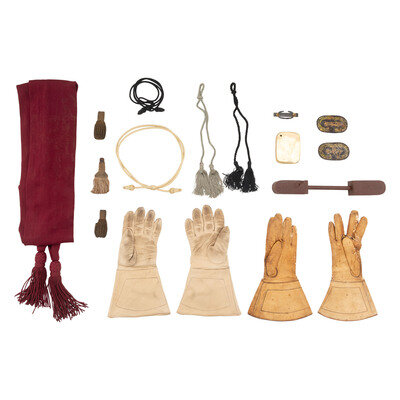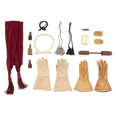 56" long reenactor's maroon officer's sash, pair of reenactor 22" long hat cords in silver and black thread, 22" long black hat cord, reenactor gold hat cord, three sword knot tips, pair of reproduction Confederate embroidered Lieutenant General's collar patches, silver and blue enamel Combat Infantryman's Badge, 2.75" x 3.75" hollow brass COLT marked decorative plaque. Also included are two pairs of white leather gauntlets, one measuring 12.75" in length and 4.25" wide across the knuckles, the other 12.75" in length and 3.5" across the knuckles.