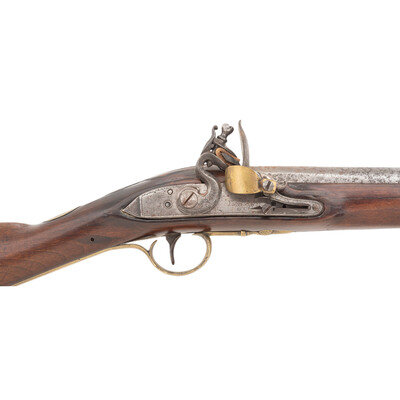 Carbine Bore (about .63 caliber). 32" wedge retained barrel with hooked breech. NSN. Bright finish, brass furniture, walnut stock. Single shot smooth bore muzzleloading flintlock fusil with socket bayonet lug on top of barrel 1" from muzzle, three ramrod pipes, open work side plate, raised carved apron around breech tang and a steel button head ramrod. 5.5" stepped flat lock with teat at rear marked KETLAND/& Co in two lines. Lock remains in original flint with an integral rounded fenced and bridled iron pan and flat faceted swan neck cock. Most of the internal lock parts, including the springs and tumbler are more modern replacements. Interior of lock with "M" makers marks and a {CROWN/36} inspection mark. Touchhole drilled and bushed with a modern bushing. No proof marks visible on top of or under the barrel. {ANTIQUE}