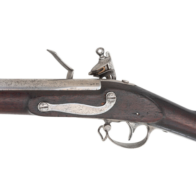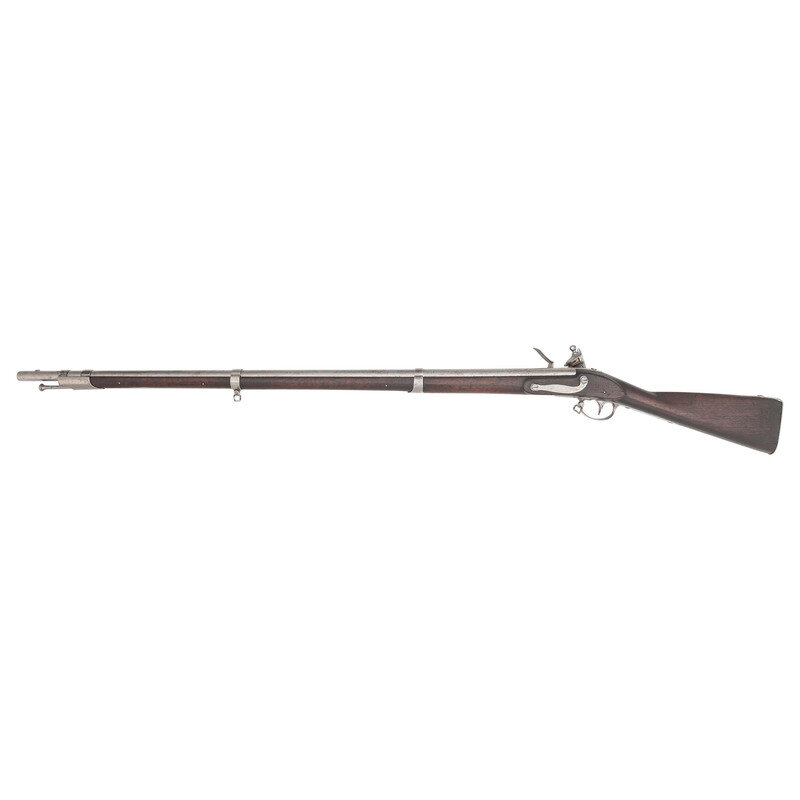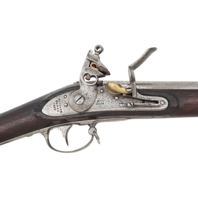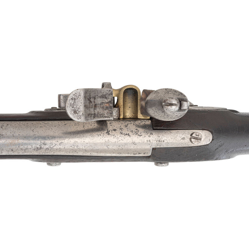 .69 caliber. 42" barrel. NSN. Bright finish, iron furniture, barrel retained by three flat, spring retained bands, full-length walnut musket stock. Single shot smoothbore muzzleloading flintlock musket with no rear sight, missing the brass blade front sight, socket bayonet lug on top of barrel, sling swivels and a short of full-length button head ramrod. Lock marked with a {Spread-Winged Eagle}/US forward of the cock and in three vertical lines HARPERS/FERRY/1838. Breech plug tang dated 1838 as well and breech with usual V/P/{Eagle Head} proof marks. The mating number "1" appears on many parts. Upper band replaced with a second spring hole drilled, somewhat ill-fitting and mismatched with the number "6". No cartouches or inspection marks are visible in the wood. Lock remains in original flint, barrel appears to be as well, although the touchhole is over sized and was clearly drilled straight through at some point in time. Harpers Ferry never produced the Model 1835/40 musket as Springfield did, and continued to produce the 1816 pattern musket (M1828 in this case) until they transitioned to making Model 1842 percussion muskets. {ANTIQUE}