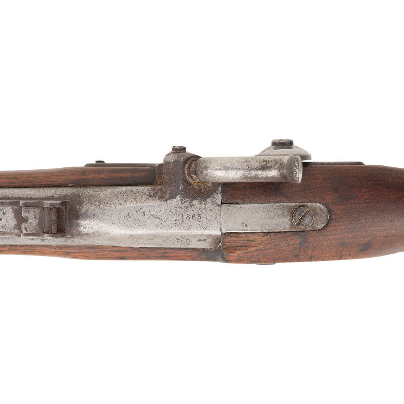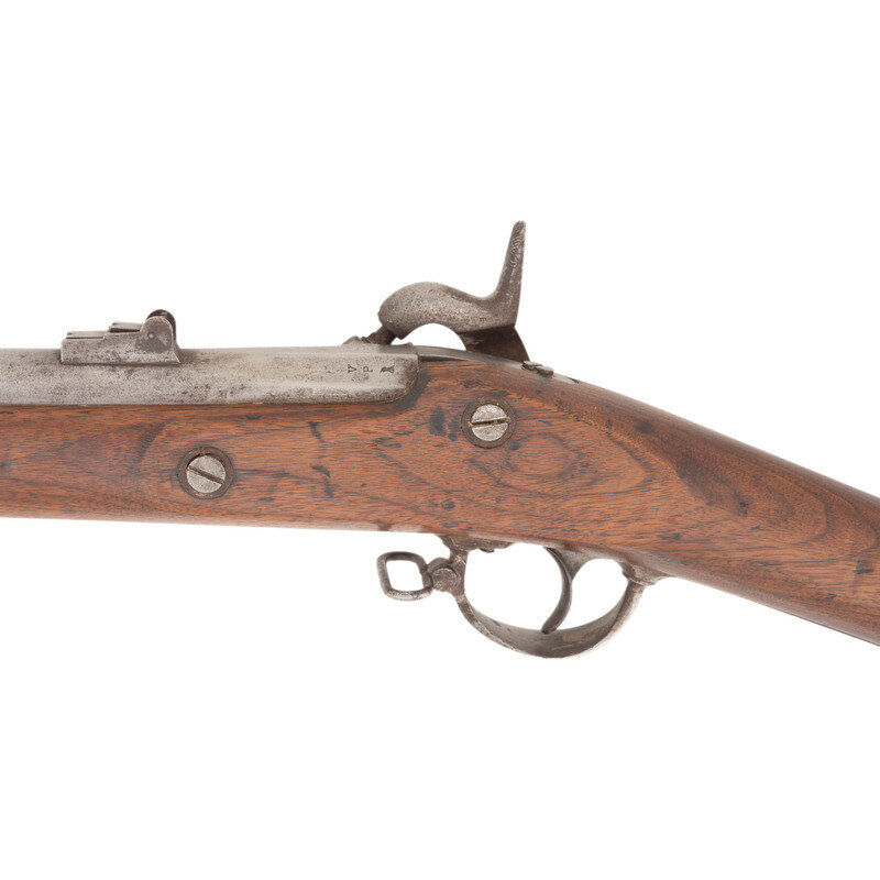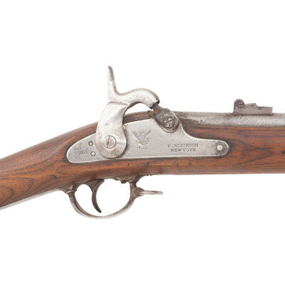 .58 caliber. 40" barrel. NSN. Bright finish, steel furniture with three flat, spring retained barrel bands, full-length walnut musket sock. Muzzleloading percussion rifle musket with 1861 pattern three-leaf rear sight, Barleycorn combination front sight and socket bayonet lug, sling swivels and swelled shank tulip head ramrod. Lock marked with a {Spread-Winged Eagle} over U.S. and E. ROBINSON/NEW YORK forward of the hammer and dated 1863 at the tail. Breech dated 1863 as well with the standard V/P/{Eagle Head} proofs on the left angled flat. No visible cartouches on counterpane. Despite receiving numerous contracts for US Model 1861 Rifle Muskets, that initially numbered as many as 90,000 guns, Robinson only managed to deliver 30,000 between 1863 and 1865. Robinson Model 1861s appear with several variants of the lock markings, including the rarely encountered U.A. CO. (Union Arms Company) mark. {ANTIQUE}