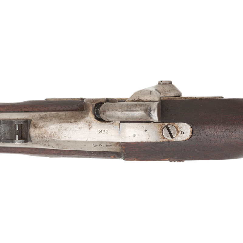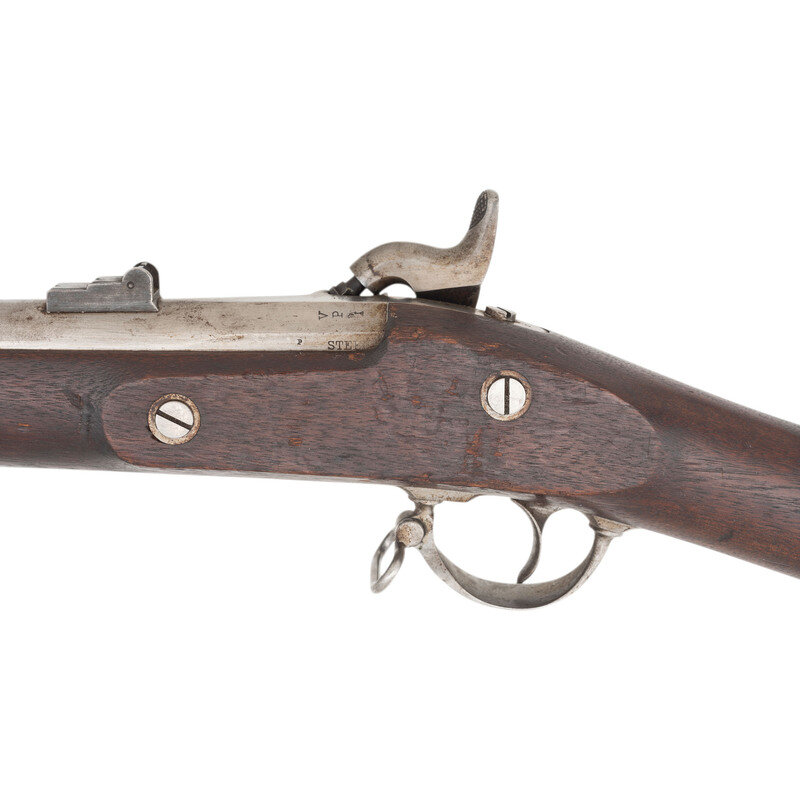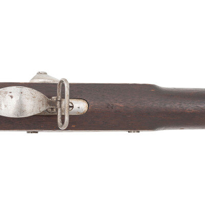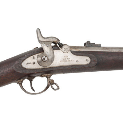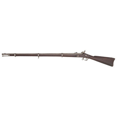 .58 caliber. 40" barrel secured by three rounded clamping bands. NSN. Bright finish, steel furniture, full-length walnut musket stock. Single shot percussion muzzleloading military rifle musket with M1861 pattern 3-leaf rear sight, Barleycorn combination front sight and socket bayonet lug, sling swivels and a straight-shank tulip head ramrod. Lock marked in three lines forward of the hammer: U.S./L.G.&Y./WINDSOR, VT. and dated 1864 at the tail. Barrel appears to be from a Colt M1861 Special Model Rifle Musket and is marked STEEL on the left flat with the usual V/P/{Eagle Head} inspection mark on the left angled flat and is dated 1863 on top of the breech. No cartouches are present on the stock flat. However, the Confederate rebuild inspection mark Z is stamped in the wood of the stock belly, forward of the triggerguard. This indicates that the gun was captured at some point and went through the Confederate C&R "clean & repair" program, which ranged from a simple cleaning and reissuing of the gun to a complete rebuild or even stripping it for parts to build other guns. The mismatched Colt barrel on what appears to be an otherwise L.G.&Y. gun is a perfect example of the work done in Richmond to keep small arms in the pipeline to the Confederate troops in the field. {ANTIQUE}