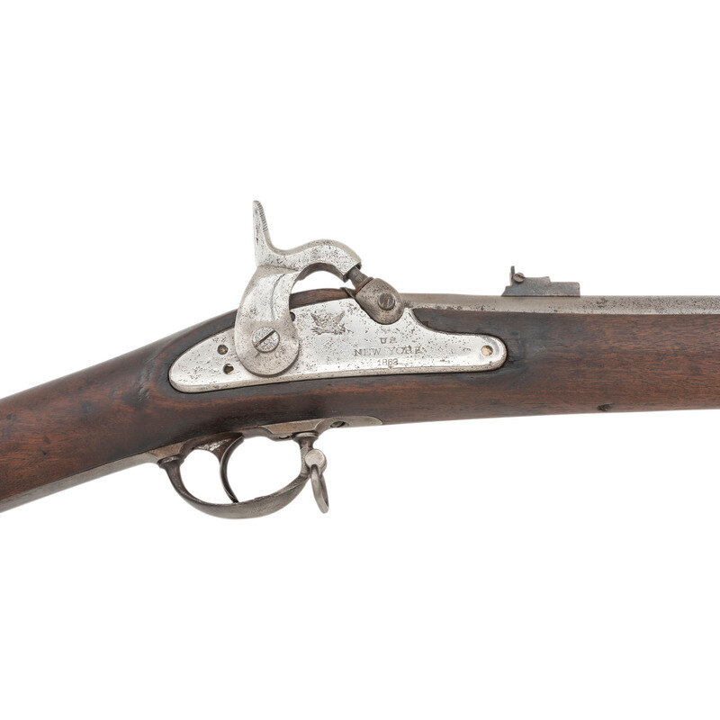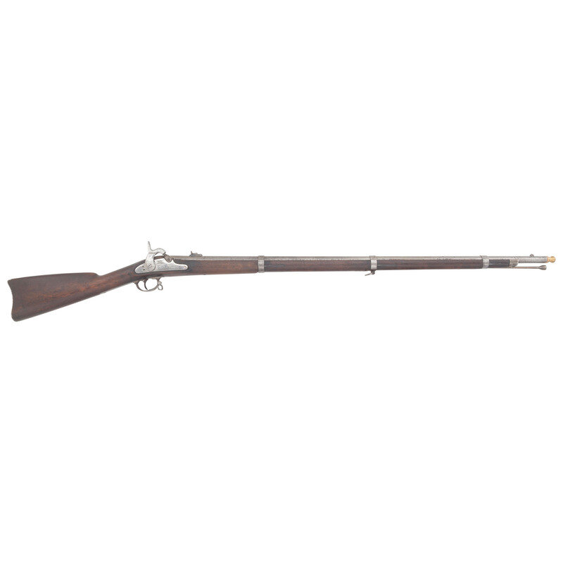 .58 caliber. 40" barrel secured by three flat, spring retained bands. NSN. Bright finish, blued rear sight, iron furniture, walnut musket stock. Single shot percussion muzzleloading military musket with correct, early M1861 production M1858 pattern three leaf rear sight base with replaced reproduction leaves, Barleycorn combination front sight and socket bayonet lug, sling swivels and an incorrect, straight shank, tulip head ramrod. Lock marked with a {Spread-Winged Eagle} forward of the hammer and in three lines U.S./NEW YORK/1862. Top of breech with a very weak date that appears to be 185?, indicating it is from an M1855 Rifle Musket. The steady pin notch forward of the rear sight mortise confirms this is an M1855 barrel. Breech with standard V/P/{Eagle Head} proofs on the upper left angled breech flat. No visible cartouches. Includes a reproduction brass tipped tompion. {ANTIQUE}