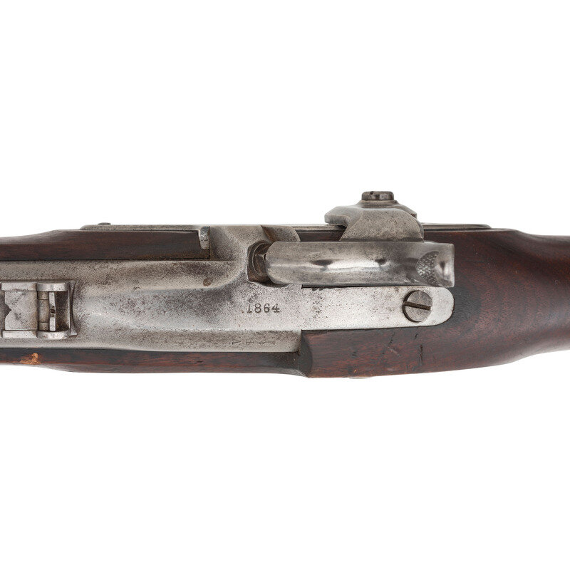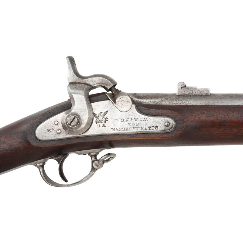 .58 caliber. 40" round barrel secured by three rounded clamping bands. SN: NSN. Bright finish, iron furniture, walnut stock. Single shot muzzleloading percussion military rifle musket with three leaf M1861 pattern rear sight, Barleycorn combination front sight and socket bayonet lug, sling swivels and a full-length straight shank tulip head ramrod. Lock marked in three lines forward of the hammer: S.N.&W.T.C./FOR/MASSACHUSETTS and with a {Spread-Winged Eagle}/U.S. The lock plate is dated 1864 at the tail. The top of the breech has a matching 1864 date and the left angled breech flat is marked with the usual V/P/{Eagle Head} inspection and proof marks and the sub-inspector initials L.F.R. are present on the left barrel flat. Two script cartouches are present on the counterpane that remain completely visible, if a little difficult to decipher. Both cartouches are the GKC of George K Charter, which is the most often encountered inspector for these muskets and one of the few that usually appears stamped twice. The US Model 1863 was for all practical purposes an adaptation of the US Model 1861 Special Model Rifle Muskets that were created by Colt and produced by them, as well as Amoskeag and LG&Y. Some contractors who were producing the US Model 1861 received permission to deliver part of their 1861 pattern contract guns as the newly adopted version. Others, like Samuel Norris and William T Clements received their contracts later in the war and those contracts specified the production of the Model 1863 Rifle Musket. Norris & Clements contracted to produce 13,000 of the guns for the state of Massachusetts in September of 1863 and the firm delivered 2,001 in 1863 and the balance in 1864. Includes a reproduction brass tipped tompion. {ANTIQUE}