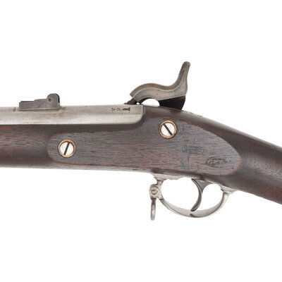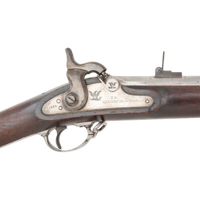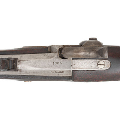 .58 caliber. 40" barrel. NSN. Bright finish, steel furniture, walnut stock. Single shot percussion muzzleloading rifle musket with three solid, rounded, spring-retained barrel bands, 1864 pattern two leaf rear sight, Barleycorn combination front sight and socket bayonet lug, sling swivels and a full-length straight shank tulip head ramrod. Lock marked with a {Spread-Winged Eagle} and U.S./SPRINGFIELD forward of the hammer and dated 1864 at the tail. Flat bolster face with {Spread-Winged Eagle} and top of breech with matching 1864 date. Left angled breech flat with usual V/P/{Eagle Head} proof marks. Two clear script cartouches are present on the counterpane, the WPT of William P Taylor and the ESA of Springfield Master Armorer Erskine S Allin. The Model 1864 was the last of the US arsenal produced muzzleloading .58 caliber percussion rifle muskets to be manufactured. {ANTIQUE}