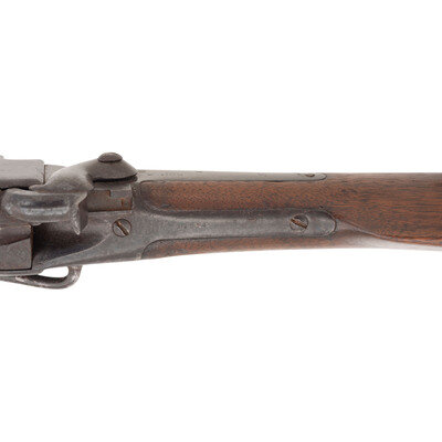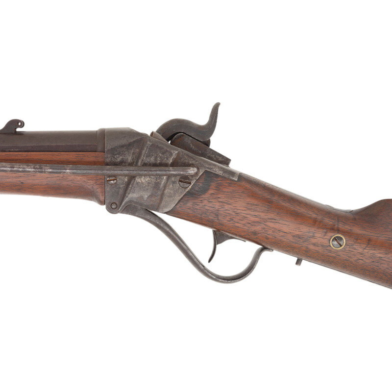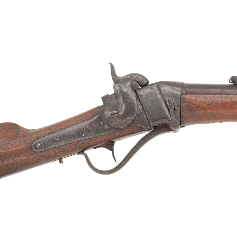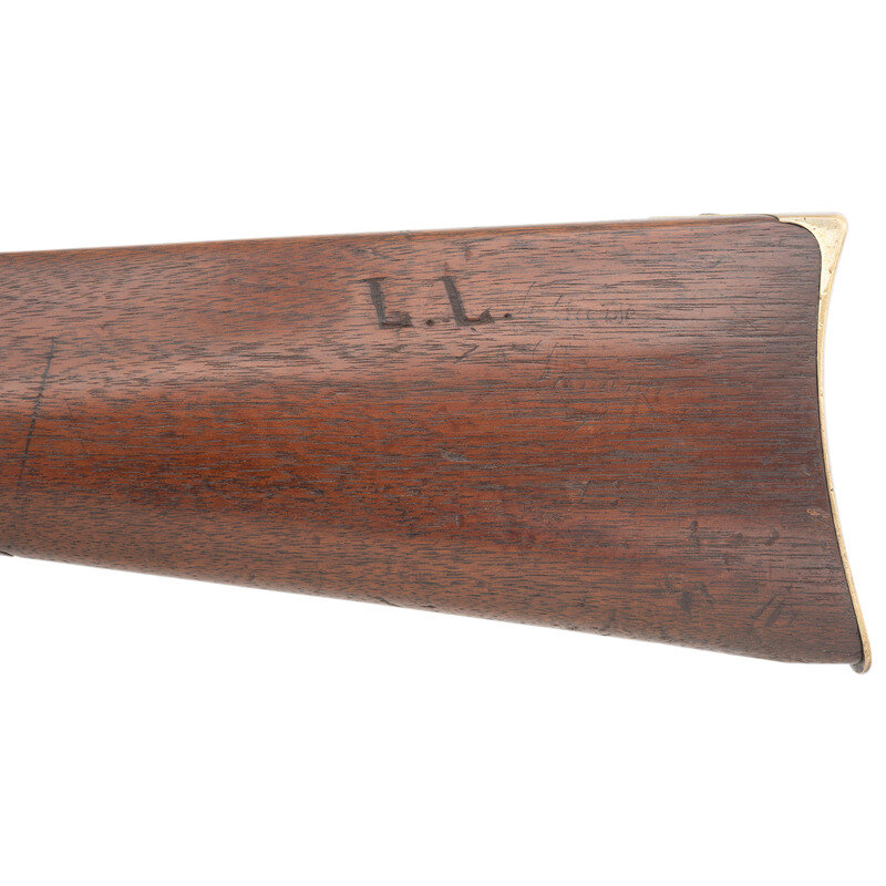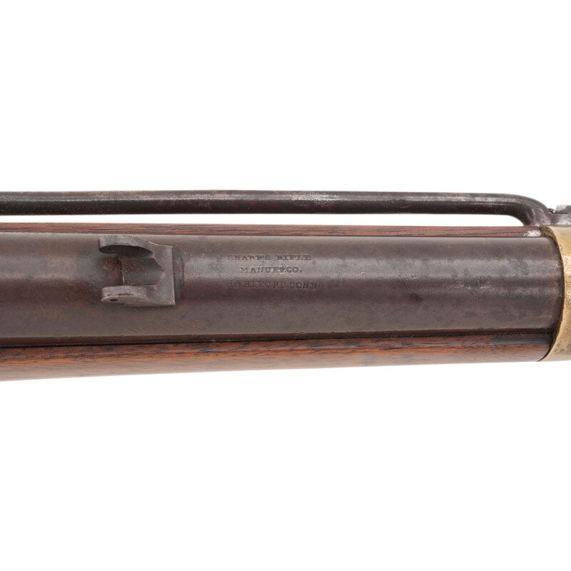.52 caliber. 21.25" barrel. SN: 12074. Blued and color casehardened finish, brass furniture, walnut buttstock and forend. Single shot percussion breechloading carbine with 9" sling bar missing ring, 1853 pattern sight base missing sight ladder and a brass blade front sight. Standard Sharps lock markings in three-lines SHARP'S/PATENT/1852, tang marked SHARPS/PATENT/1848 and with serial number, barrel marked SHARPS RIFLE/MANUFG CO/HARTFORD, CONN. Matching serial numbers on receiver tang and under barrel, forend with heavy restoration and no number present. Carvings on reverse of butt with the deeply cut initials L.L., and much more lightly carved script name and possibly additional information, which is not legible. A search of published John Brown serial numbers finds that 1853 Sharps Carbine #12077 was in case #321 and is a documented John Brown purchased Sharps. This gun was not found in any available records, but is only three numbers from the documented John Brown Sharps. {ANTIQUE}