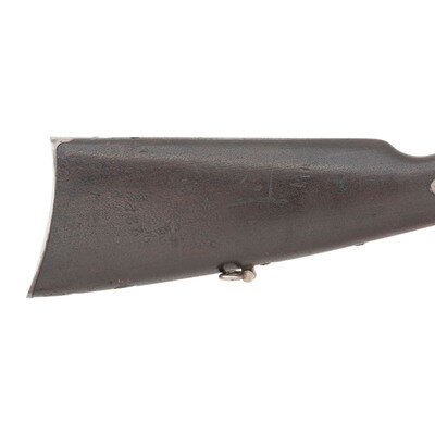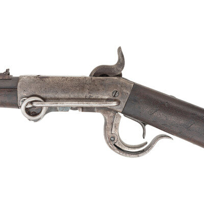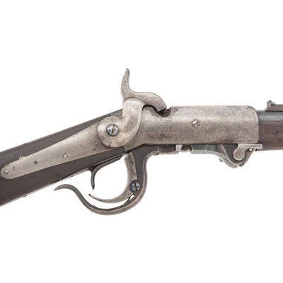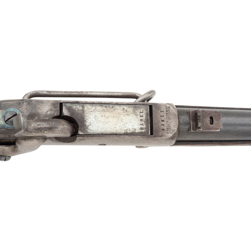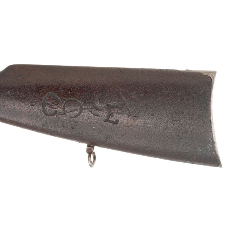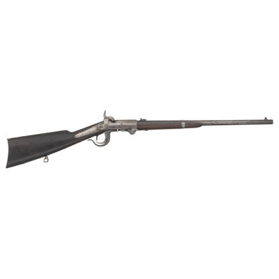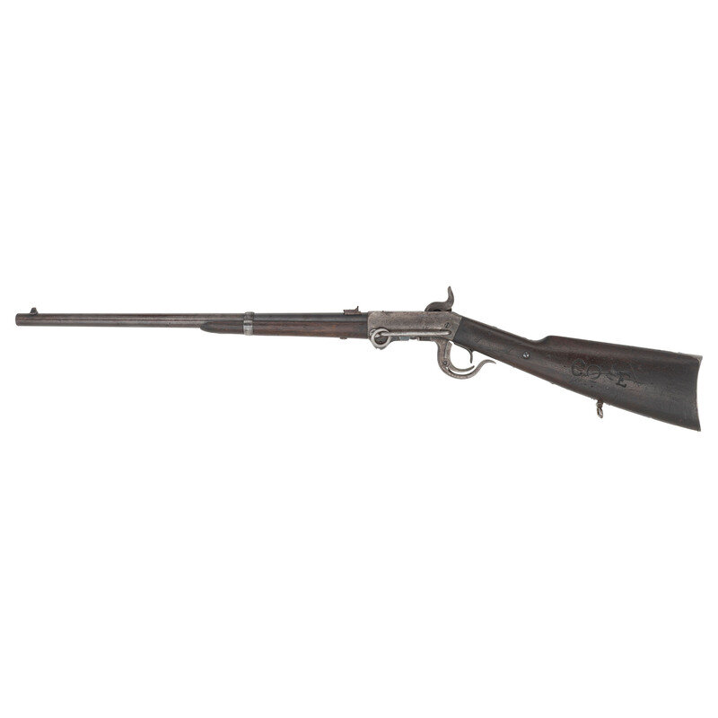 .54 caliber. 21" round barrel secured by a single spring-retained barrel band. SN: 11878. Blued and color case hardened finish, smooth walnut stock and forend. Single shot percussion carbine with tilting block receiver, L-shaped leaf rear sight, pinched front sight blade, sling swivel in toe of stock and saddle bar and ring opposite lock. Lock marked in two lines behind the hammer BURNSIDE RIFLE CO/PROVIDENCE, RI. Chamber marked in two lines BURNSIDE PATENT/MODEL OF 1864. Barrel marked in a single weak line forward of the rear sight CAST STEEL 1864. Two weak script GC (George Curtis) inspection cartouches are present at the reverse wrist. Obverse butt stamped with a large number of "2" marks, reverse of butt with a deeply carved CO E marking. Matching serial numbers on receiver and breech block. This carbine was not located in the Springfield Research Service database, however the closest guns bracketing this number are #11826 which was issued to Company K of the 4th Wisconsin Cavalry and #11891 which was issued to Company H of the 6th Ohio Cavalry. {ANTIQUE}