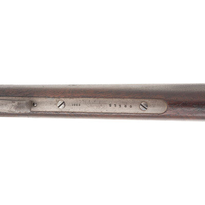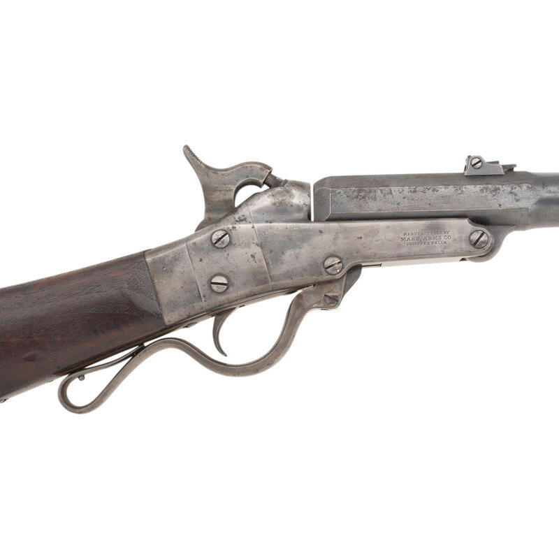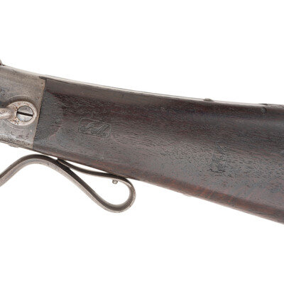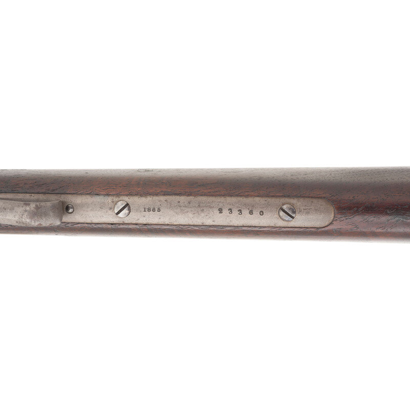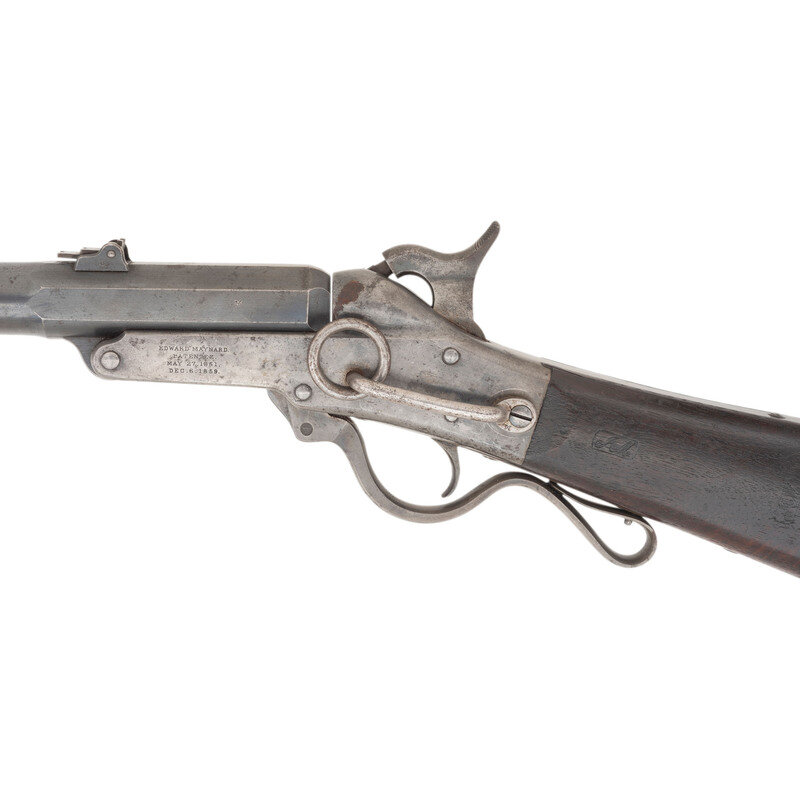 .50 caliber. 20" barrel. SN: 23360. Blued barrel, color casehardened frame, iron furniture, blued screws, smooth, straight gripped walnut stock. Single shot percussion tip down barrel breechloading carbine with three leaf rear sight, pinched blade front sight and saddle ring on the reverse of the receiver. Standard three-line Massachusetts Arms Company marking on lower right of receiver and standard patent markings on lower left. Serial number on lower tang, along with 1865 date. Two clear and correct script cartouches on reverse wrist, both the JM of James Mills. The Maynard Carbine was one of the most successful breechloading percussion carbines of the American Civil War, due to its simple and robust design. Slightly more than 20,000 were delivered between 1863 and 1865 with many of the guns seeing use with Indiana Volunteer Cavalry Regiments, including the 6th, 9th & 11th. The Maynard was also issued to the 11th Tennessee Cavalry (US). {ANTIQUE}