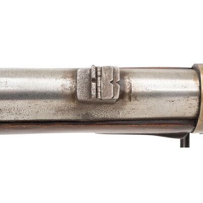 .58 caliber. 24" barrel. SN: 591. Bright finish, brass furniture, European hardwood stock. Single shot percussion muzzleloading rifled carbine with British P1856 type 3-leaf rear sight, dovetailed front sight blade, saber bayonet lug 4" from muzzle with .75" guide key, sling swivels and a steel ramrod with a dished button head. Lock marked with the Hollis & Sons logo at the tail and in three lines forward of the hammer ISAAC HOLLIS & SONS/LATE/HOLLIS & SHEATH. Breech plug tang numbed 591. An interesting Anglicized version of the French Model 1846 Artillery carbine, the design combines typical Enfield-style features like the lock profile, lock escutcheons and carbine leaf rear sight with a standard French design. During the Franco-Prussian War, the English did provide arms on contract to the French of many patterns, ranging from English made copies of the M1866 Chassepot Rifle to more mundane percussion arms like this one. The firm of Isaac Hollis & Sons were gun, rifle and pistol makers who worked under that name from circa 1861-1900 and was the successor to the earlier firm Hollis & Sheath (1849-1861). The company produced a wide array and large number of firearms of all types, serving the British War Department, commercial buyers, the fur trade and even foreign governments. Hollis was one of the contractors to produce French Chassepot under license from the French government. {ANTIQUE}