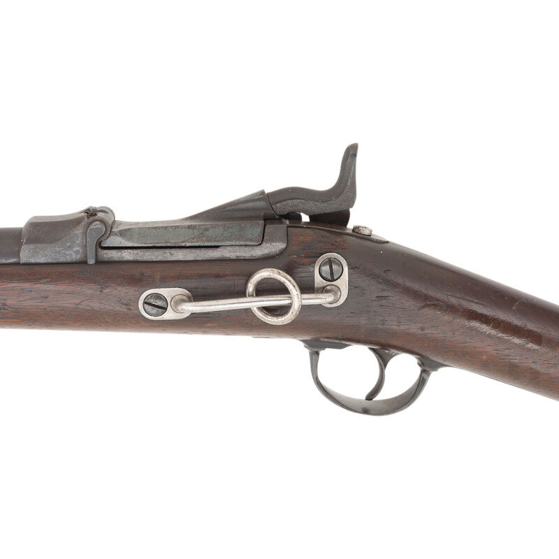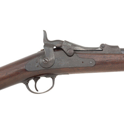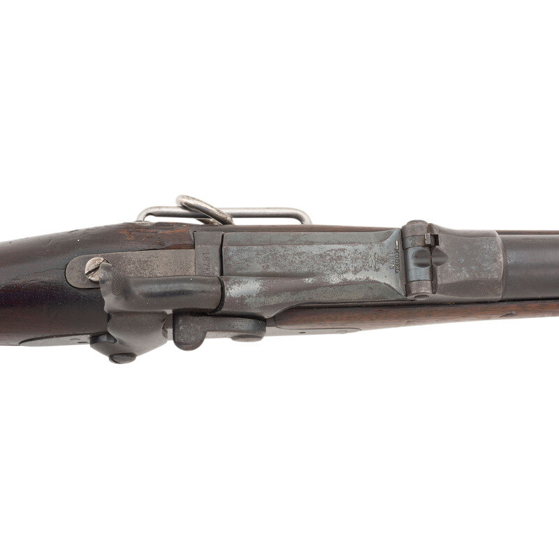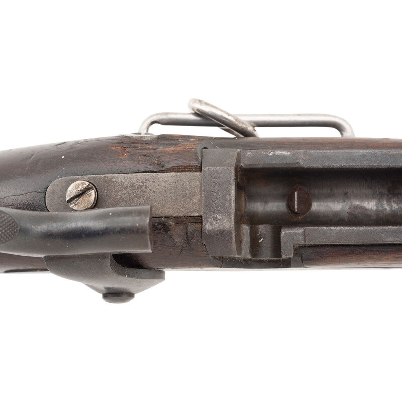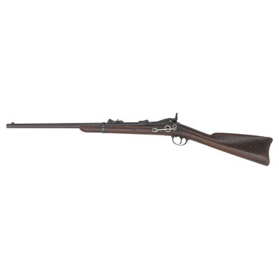 .45-70 caliber. 22" barrel with single barrel band without stacking swivel. SN: 187567*. Blued and color casehardened finish, smooth walnut stock. Single shot breechloading cavalry carbine with "C" marked 1879 pattern rear sight, front sight base missing the pinned blade, 3-click tumbler, smooth trigger, saddle bar and ring and trapdoor in butt for tools and cleaning rods. Standard production lock markings, early production high arch breech block with early style markings including the {Eagle Head} and {Crossed Arrows}. No visible cartouche or "Circle-P" firing proof in wood. Barrel with standard V/P/{Eagle Head} marks and an additional "P" mark. These "star" marked carbines were assembled at Springfield for the use of state militias (National Guard) circa 1881-1882, using available parts on hand, including a combination of newly made and salvaged parts from earlier guns that had been turned in, thus they do not always conform exactly to standard production models in terms of features or markings. {ANTIQUE}
