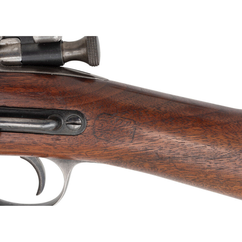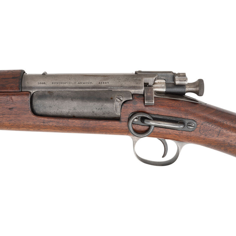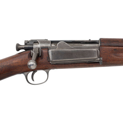 .30-40 Krag. 22" barrel. SN: 25087. Blued finish, casehardened receiver, steel furniture, walnut carbine stock with 6.75" hand guard. Bolt action repeating military carbine with side mounted fixed magazine, M1896 "C" marked carbine rear sight with sight protecting single barrel band, Barleycorn post and pinned blade front sight, saddle bar and ring and trapdoor in butt for cleaning rods and oiler (not present). Receiver marked in a two lines: US/1895. SPRINGFIELD ARMORY 25087. Traces of a correct weak script JCA (James C Ayers) cartouche over an illegible date are present on the reverse wrist with a weak {Circle-P} firing proof behind the triggerguard plate. The Model 1896 Krag Carbine was officially adopted on May 23, 1895 with the first issues taking place in March of 1896. Some of the earliest production receivers were marked only with the 1895 production date, like this example. In William Brophy's seminal work on the subject he notes that the lowest 1896 carbine receiver number he had noted was 25,293. This example is slightly lower than Brophy's non-scientific study had recorded, suggesting that this is one of the very first of the 1896 Krag Carbines to be produced. Most serial number lists place the beginning serial number for 1896 production of Krags at about 30,000. A search of the Springfield Research Service serial number books supports this, as 1896 Carbine #25,083 (only 4 numbers from this gun), was noted as being tested at Springfield Arsenal and later shipped to San Antonio Arsenal. #25,231 was also a test gun which was used by a Captain Fuller for those purposes. Other SRS documented M1896 Krag Carbines close to this gun include #25027, #25095 and #25,101 which were all sold as surplus by the Raritan Arsenal on July 31, 1922. A rare, early production Krag carbine in reasonably good condition. {ANTIQUE}