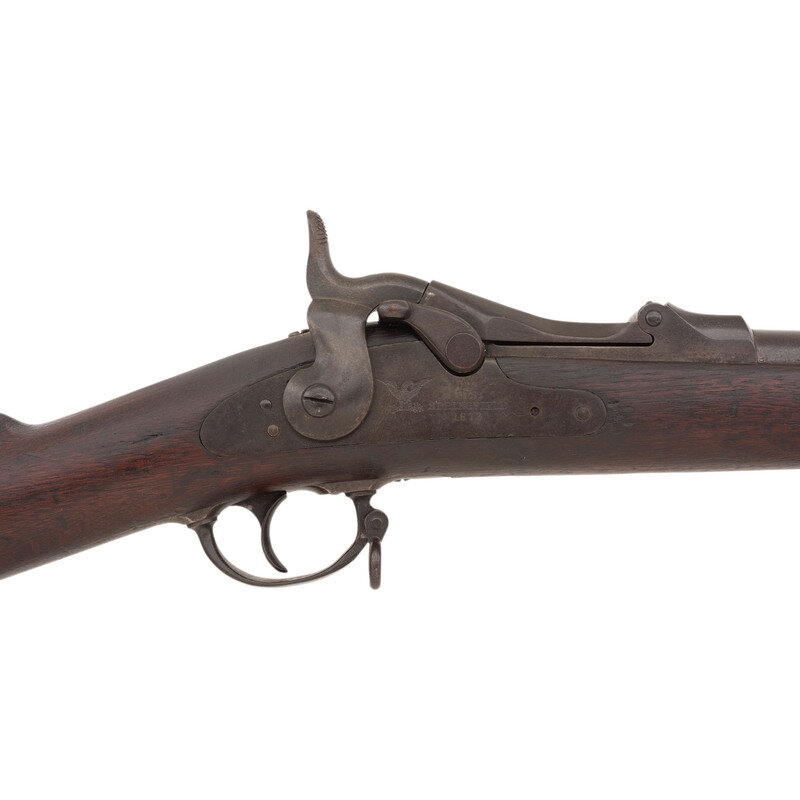 .45/70. 32.5" barrel length. SN: 172638. Blued finish with casehardened frame and breechblock mounting a full length straight wrist stock retained by two barrel bands. Single shot trapdoor action breechloading rifle mounting adjustable ladder rear notch and front blade sights. Lockplate is marked with the {US Army Eagle} followed by U.S./SPRINGFIELD/1873. Upper surface of the low arch breechblock is struck U.S/MODEL/1873. Barrel is proof marked with V/P/{double stamped Eaglehead}/P. Rifle mounts a three-click tumbler, and a frame the same width as the barrel. Freefloating firing pin. Star mark on the rear receiver near serial number indicates this item was most likely built using overrun and reclaimed parts, hence the mixture of early and later features. Stock has been sanded, rendering the cartouches on the counterpane illegible. Comes with cleaning rod. {ANTIQUE}