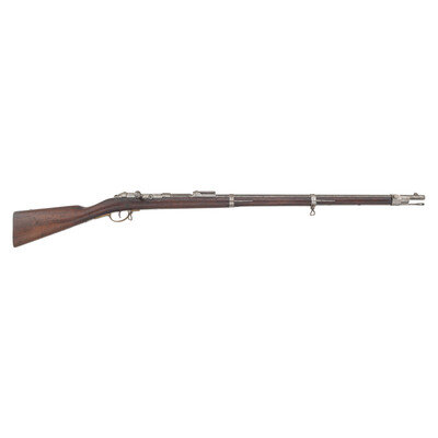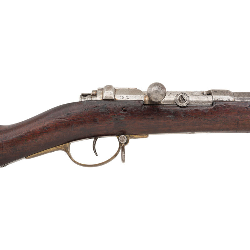 11x60mm. 33.7" barrel length. SN: 8219.O. Polished metal finish with walnut straight wrist full length stock mounting folding rear notch and front blade sight. Single-shot bolt action rifle with octagonal receiver featuring front and rear sling loops, the latter mounted to the front of a brass triggerguard. Serial numbers mixed on bolt components. Right receiver is dated 1875 with the rear barrel flat marked OESTERR WAFF.B.GES. indicating it was made by OWG. Upper left barrel flat struck {Crown/FG} and shows an 11.1 bore gauge marking. Gothic letter inspection stamps to major components with the upper left receiver showing the model marking I.G. Mod.71. {ANTIQUE}