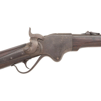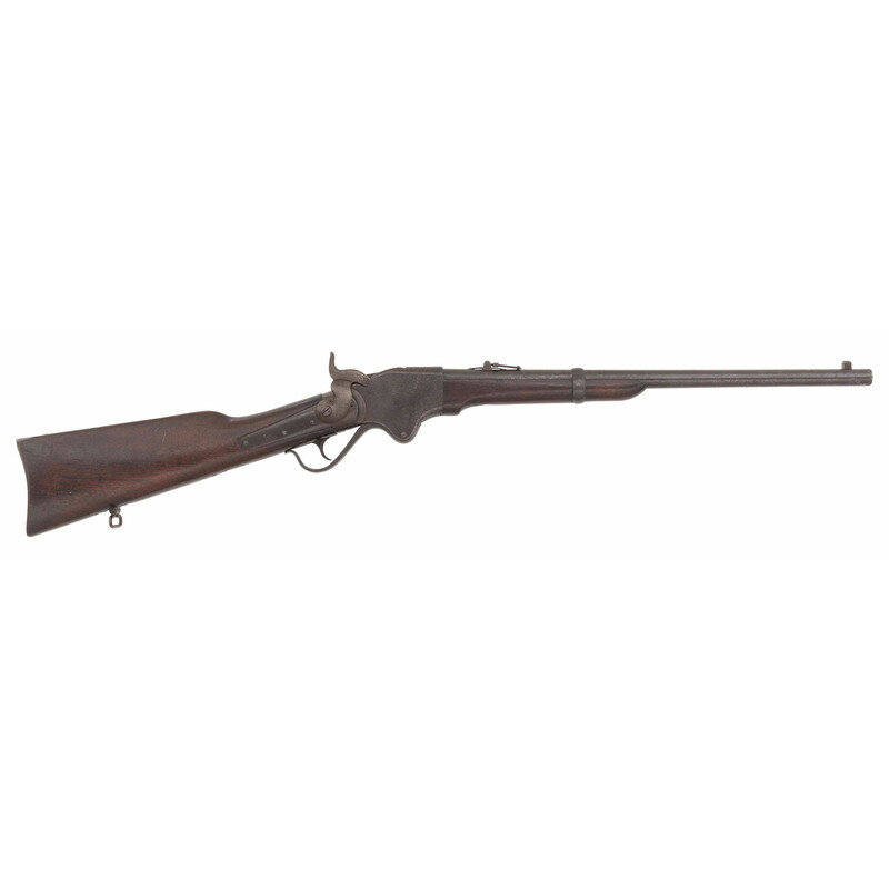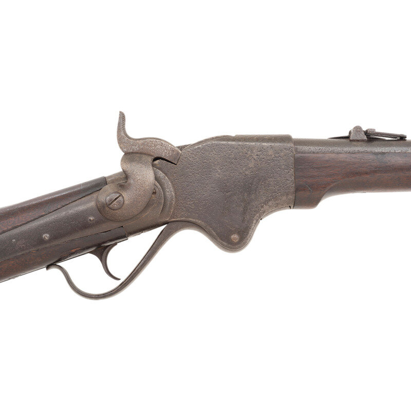 .50 Spencer. 20" round barrel secured by a single spring-retained barrel band. SN: 508?. Blued and color casehardened finish, smooth walnut stock and forend. Lever action manually cocked 7-shot repeating carbine fed from a tubular magazine in the butt, with folding ladder rear sight, blade front sight, smooth bottom Civil War era magazine follower tube, saddle bar and ring and sling swivel in toe. Markings on the top of the receiver are almost completely obscured by pitting. No visible cartouches. {ANTIQUE}