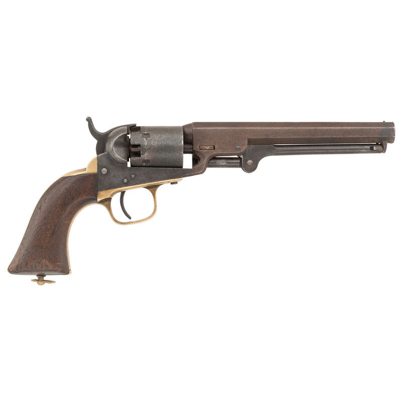 .31 caliber. 6" barrel. SN: 162509 (mfg. ca. 1860). Blued and color casehardened finish now a brown patina, silver plated brass backstrap and triggerguard, smooth one-piece walnut grip. Single action percussion revolver with five chambered unfluted roll engraved cylinder, hammer nose notch rear sight, brass cone front sight and a small brass lanyard ring added to the butt. Barrel with righthand two-line bracketed New York address, lower left of frame with COLT'S/PATENT mark. All visible serial numbers match, wedge is an old, crude, unnumbered replacement. {ANTIQUE}