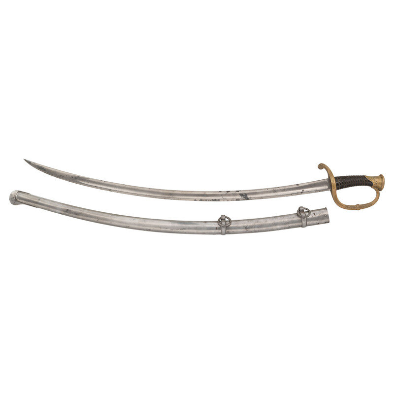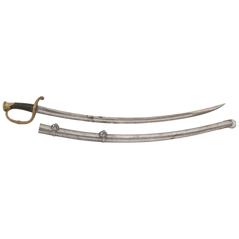 31.5" curved single-edged blade with 26" stopped median fuller. Overall length 37.25" with blade 1.25" wide at ricasso. 5.5" hilt with cast brass knuckle bow and guard with forward swept disc quillon. Rudimentary Phrygian helmet pommel cap. Brass guard decorated with simple folate motifs. Grooved horn grip with 14 wraps of twisted wire. Leather throat washer on face of guard. Spine of blade with weak script Klingenthal arsenal marking. Includes a seamed steel scabbard with riveted throat and two suspension rings.
