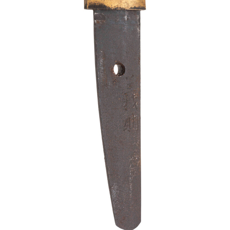 15.8" Nagasa (blade length). 22.75" overall with Tsuka (hilt) and Saya (scabbard). Shinogi-Zukuri style blade with O-Kissaki and patina obscuring the Hamon and Boshi. Item features an Ihori Mune, Sentoku Habaki, and single hole to signed Nakago. Black finished Shakudo Fuchi and Kashira display a prominent chili pepper motif with matching Menuki to both sides of the Tsuka. Traditional white same with black grip tape. Black finished Shakudo Tsuba with gold and silver flower petals. Saya is lacquered black wood cut for Kozuka that is not present.