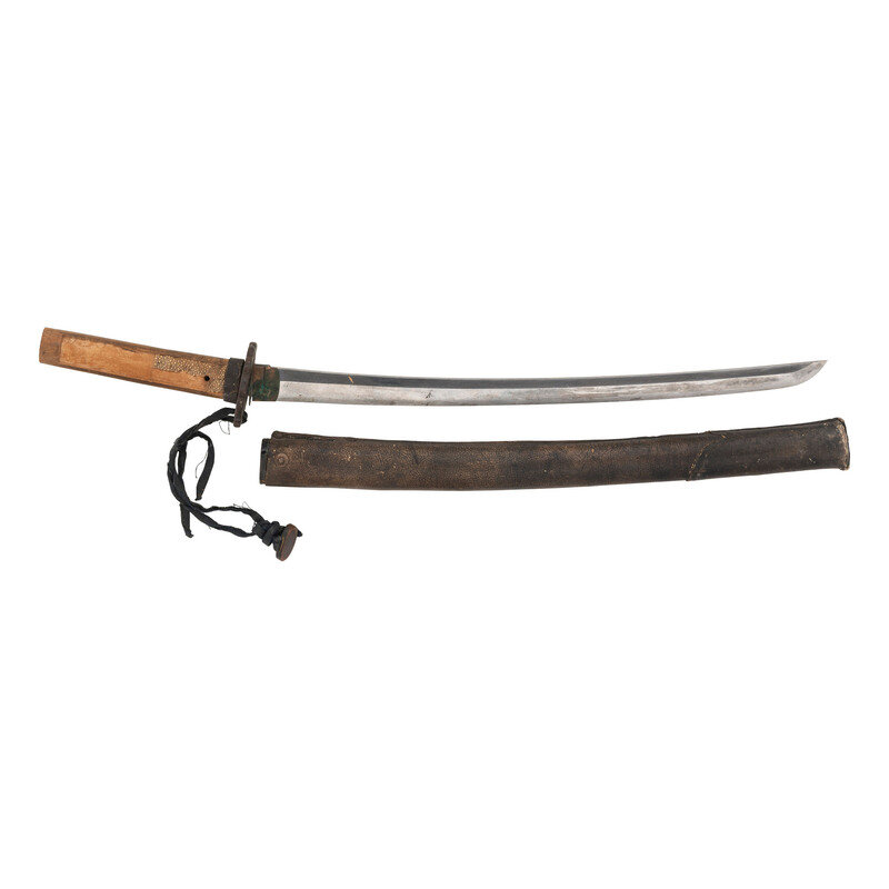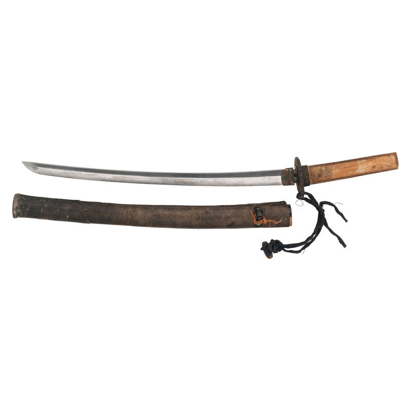 18.125" Nagasa (blade length). 26" overall with Tsuka (hilt) and Saya (scabbard). Shinogi-zukuri pattern blade with O-Kissaki and Ihori mune. Blade displays Omaru Boshi and Toran Hamon line with Mokume Hada. Nakago is in the Futsu shape with Kuri-Jiri tip and a single hole. Features a Shakudo Habaki. Fittings consist of a pierced iron tsuba, black finished Nanako Shakudo Fuchi and horn Kashira with the grip tape and Menuki lost, and only traces of white same remaining. The black laquered wood Saya is leather wrapped. Signature to Nakago by Hisahiro, indicating it was likely made about 1650.