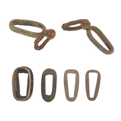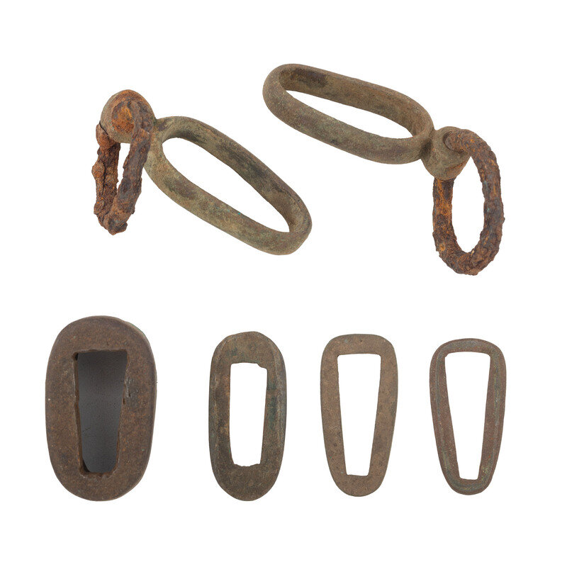 Includes brass upper internal scabbard mount with iron throat, two brass suspension mounts with iron rings and two tapered roughly triangular brass spacers, probably from a scabbard throat as well.