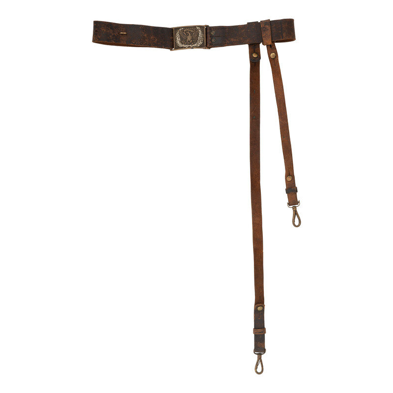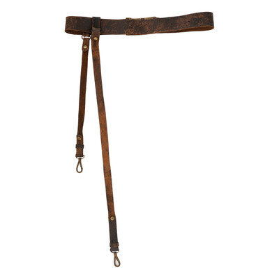 Nominally 38" in overall length and 1.75" wide. Currently adjusted for a nominally 36" waist. With 1851 Pattern enlisted Eagle motif sword belt plate with applied silver wreath and long, narrow tongue. No bench numbers on plate or keeper. Belt includes two sliding leather sword hangers with brass snap swivels. Keeper end of belt secured with stitching and two large copper rivets.