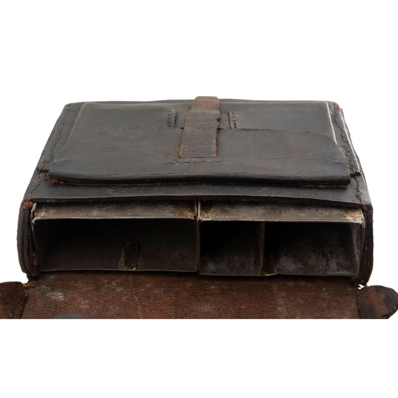 Nominally 7" by 5.375", not including the outer flap, with implement pouch on inner face and tinned magazine inserts, one missing the upper divider. Inner flap with stamped W.S. HANSELL & SONS maker's mark. Rivet reinforced belt loops, sewn only latch tab. Sling buckles detached. Includes sling and oval box plate on face of box and Eagle breast plate on sling.
