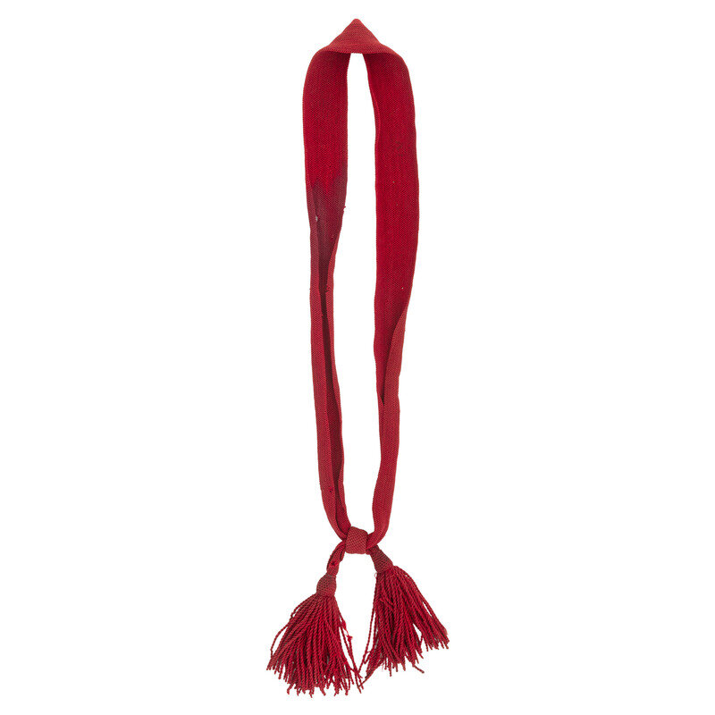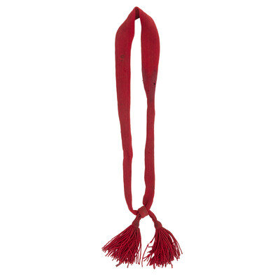 Red worsted wool sash woven in a net style to be somewhat stretchy, nominally 75" in overall length including tassels. Nominally 2.5" wide. Tassels nominally 7" in length including the woven "acorns". This variant of the NCO sash has a fixed sliding loop woven of the same material as the sash itself and this is how the sash's tension is adjusted, rather than simply warping it around the wearer and tying it off. An attractive sash for use in a display or on a mannequin with a uniform coat.