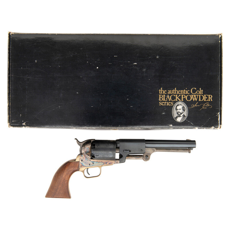 .44 Cal. 7.5" barrel length. SN: 49290. Blued and casehardened finish with brass gripstraps mounting walnut one piece grips, octagonal to round barrel, and brass front blade with hammer rear notch sights. Single action six-shot percussion revolver featuring Ormsby's Ranger and Indian scene to cylinder. Markings include Italian black powder firing proofs, and Armi San Marco maker marking. Comes in original cardboard box. {ANTIQUE}