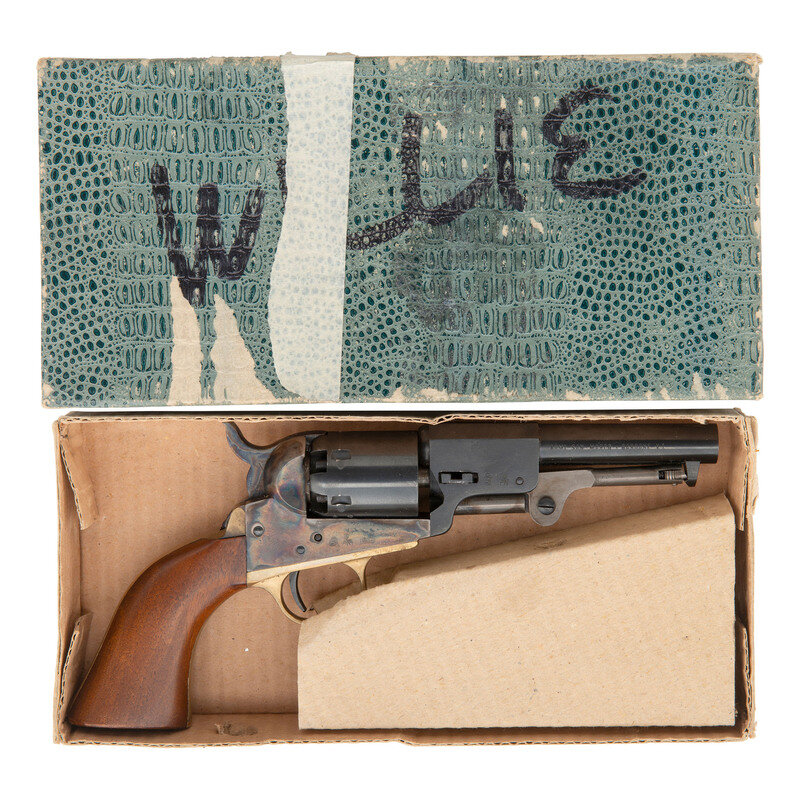 .31 Cal. 4" barrel length. SN: 35334. Blued and casehardened finish with brass gripstraps, one piece walnut grips, and octagonal to round barrel. Single action six-shot percussion revolver with loading lever brass front bead, and hammer rear notch sights. Markings include Armi San Marco maker marks, and Italian black powder firing proofs. Comes with alligator skin pattern cardboard box. {ANTIQUE}