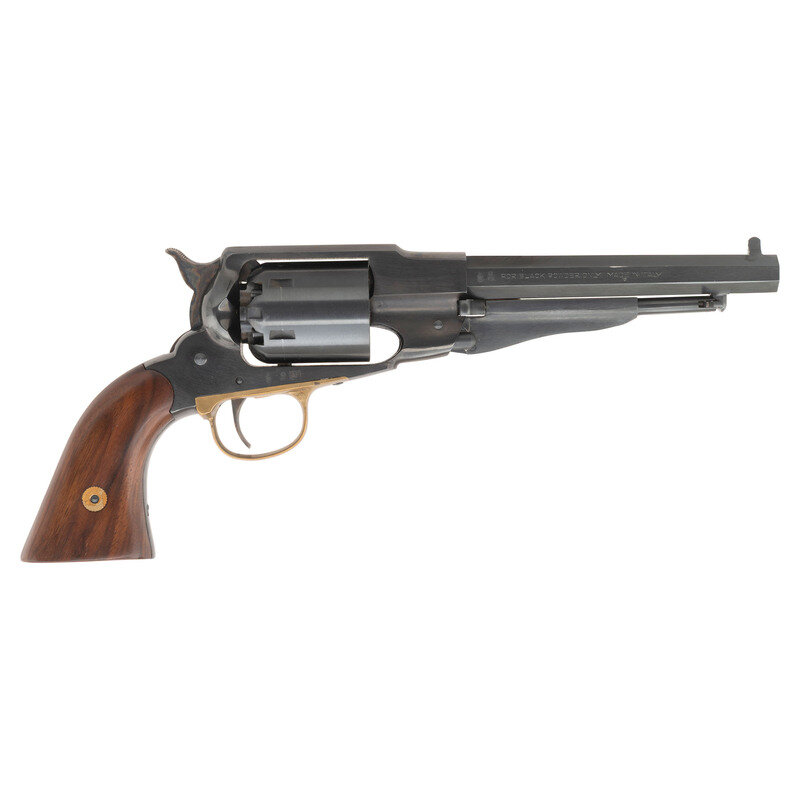 .36 Cal. 6.5" barrel length. SN: 091791. Blued metal finish with casehardened hammer, brass triggerguard, and mounting two piece walnut grips. Single-action six shot percussion revolver with octagonal barrel and mounting front blade and topstrap rear notch sights. Item features Italian black powder firing proofs with E.M.F. mark to upper barrel. {ANTIQUE}