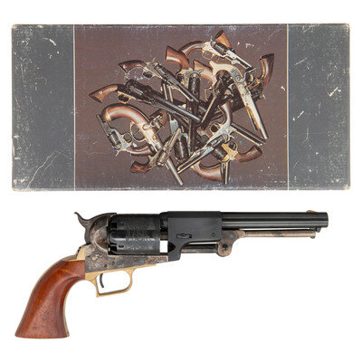 .44 Cal. 7.5" barrel length. SN: A9367. Blued and casehardened finish with brass gripstraps mounting one piece walnut grips and octagonal to round barrel with round cylinder stops to cylinder. Single action six-shot percussion revolver featuring Ormsby's Ranger and Indian scene to the cylinder, Colt New York address on upper barrel flat, and Italian black powder firing proofs. Comes in original cardboard box without foam lining. {ANTIQUE}