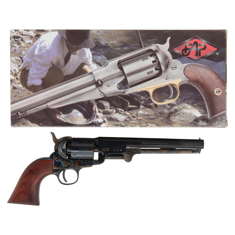 .36 Cal. 7.5" barrel length. SN: 690407. Blued and casehardened finish with walnut grips featuring brass front bead and hammer rear notch sights. Single action percussion revolver with six shot cylinder showing Ormsby's Naval Engagement scene. Standard make and model markings include PIETTA marks, Italian black powder firing proofs, and caliber mark. Comes in original cardboard box. {ANTIQUE}