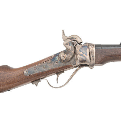 .54 caliber. 22" barrel. SN: 54340. Blued and color casehardened finish, steel furniture, hardwood stock and forend. Single shot percussion dropping block replica military carbine with folding ladder rear sight, Barleycorn front sight and sling bar and ring on reverse wrist, opposite lock. IAB markings, as well as standard black powder only warnings and caliber marking. {ANTIQUE}