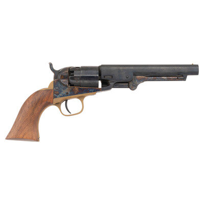 .36 caliber. 5.5" octagonal barrel. SN: A39504. Blued and color casehardened finish, brass triggerguard and backstrap, smooth one-piece hardwood grip. Single action percussion revolver with five chambered rebated cylinder, toggle link loading lever, hammer nose notch rear sight and brass post front sight. Italian proofs. Includes a reproduction compartmentalized wood case with accessories that include a powder flask, bullet mold and nipple key. {ANTIQUE}
