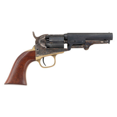 .31 caliber. 4" octagonal barrel. SN: A39102. Blued and color casehardened finish, brass backstrap and triggerguard, one-piece smooth hardwood grip. Single action percussion revolver with 5 chambered unfluted cylinder, toggle link loading lever, hammer nose notch rear sight and brass cone front sight. Italian proofs. Includes a reproduction compartmentalized wood case with a bullet mold, powder flask and nipple key. {ANTIQUE}