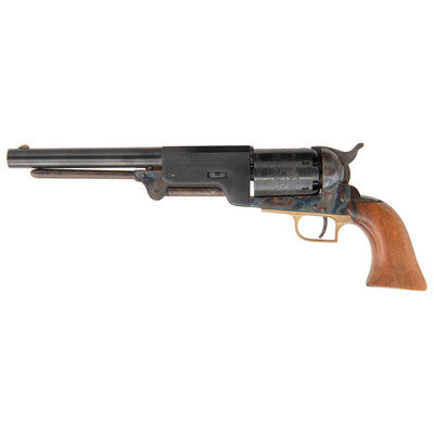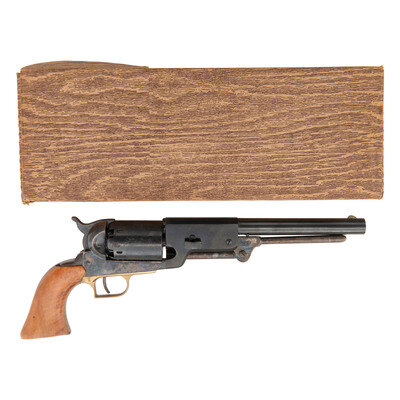 .44 Cal. 9.125" barrel length. SN: 14281. Blued and casehardened finish with brass forward grisptrap and blued rear strap mounting one piece walnut grips, and patterned after the Colt Walker Model 1847 revolver. Single action six-shot percussion revolver with folding loading lever and mounting brass front blade and hammer rear notch sights. Cylinder is roll engraved with Ormsby's Rangers and Indians scene, with Italian black powder proofs to major parts, and model information on left barrel. Comes in a matching cardboard box.{ANTIQUE}