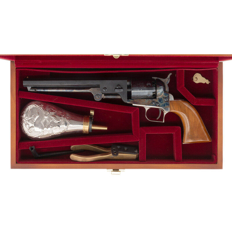 .36 Cal. 7.5" barrel length. SN: 50835. Blued and casehardened metal finish with nickel plated gripstraps and polished walnut one piece grips. Six-shot percussion revolver with octagonal barrel, front brass bead and hammer rear notch sights. Item shows Italian maker markings and LYMAN importer mark to upper barrel. Lower barrel is electropen marked with the number M 460 843 745 969. Comes in maroon velvet lined wood case with powder flask, two-chamber bullet mold, and multitool. {ANTIQUE}
