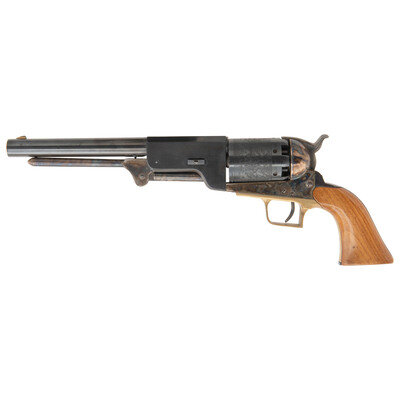 .44 Cal. 9.125" barrel length. SN: 32. Blued and casehardened metal finish with brass forward gripstrap and one piece varnished wood grips. Single action six-shot percussion revolver with folding loading lever to octagonal to round barrel. Right barrel flat is marked US/1847 with the address struck to the upper flat in a single line reading ADDRESS SAML COLT NEW-YORK CITY. Cylinder is roll engraved with Ormsby's Ranger and Indian scene and further marked REPLICA ARMS CO. Lower frame is struck S. MARCO below the serial number. Italian firing proofs to major parts. {ANTIQUE}