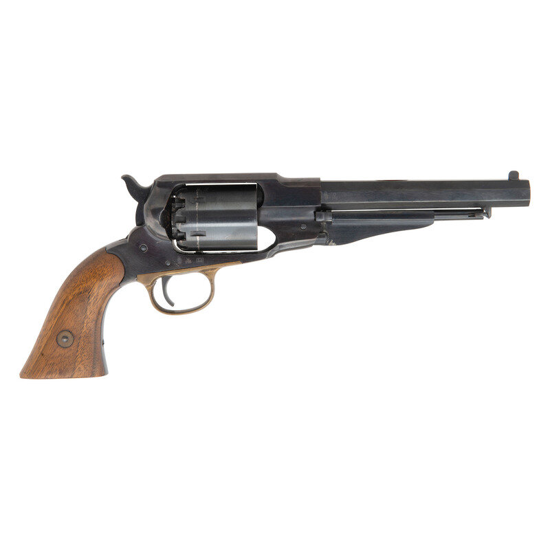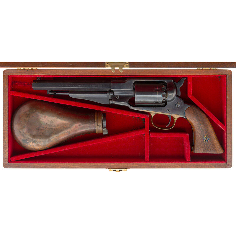 .36 Cal. 6.5" barrel length. SN: 06818. Blued metal finish with brass triggerguard mounting two piece walnut grip panels and standard front blade and topstrap rear notch sights. Single action six-shot percussion revolver featuring a loading lever to octagonal barrel. Standard make and model markings including Pietta maker mark to lower barrel, and Italian black powder firing proofs. Comes in red velvet lined wood presentation case. Included in the box is a powder flask that is missing its spout. {ANTIQUE}