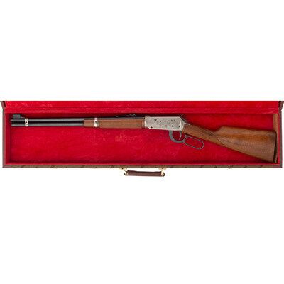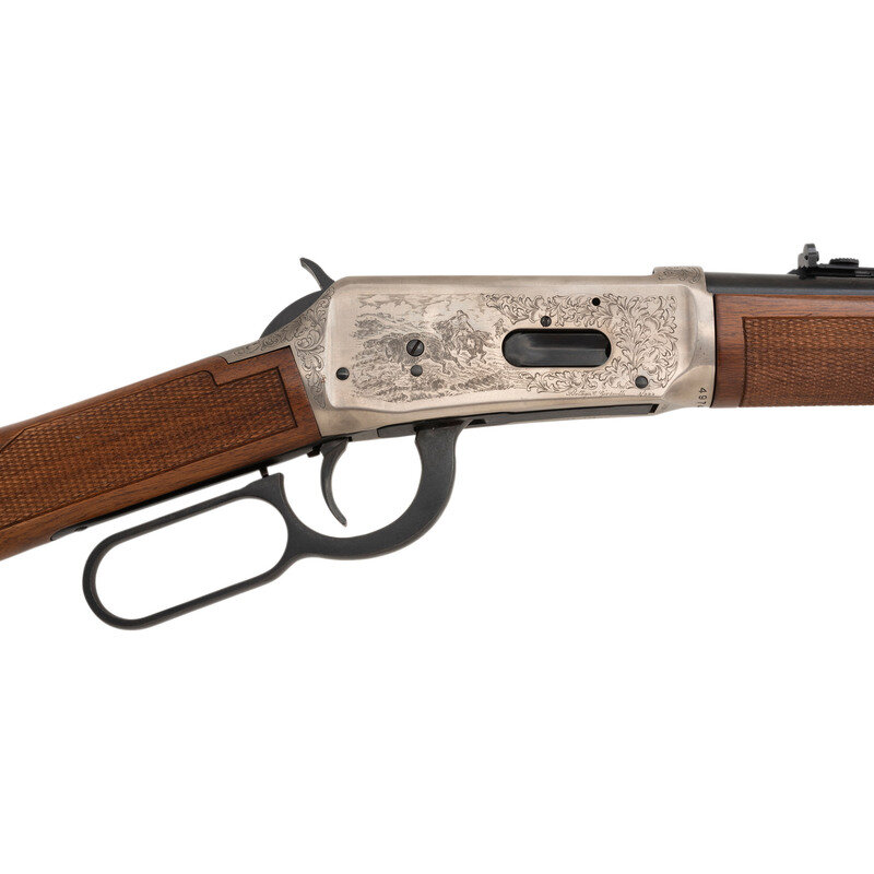 .30-30. 20" barrel length. SN: 4974613. Blued metal finish with barrel bands and receiver in the white mounting walnut straight wrist stock featuring checkering to wrist, forend, and butt. Lever action repeating commemorative rifle commemorating Western Artists. Markings include Italian firing proofs to major parts, and the signature of engraver Bottega C. Giovanelli to right receiver. Barrel is engraved "Great Western Artists" I. Engraving on the receiver features American Indian horsemen hunting buffalo to the right, and Outlaws attacking HOFFMAN HOTEL to the left. Comes in a Winchester branded canvas wrapped case. Included with the rifle are two framed prints signed by Giovanelli depicting the engraving used on this rifle. {MODERN}