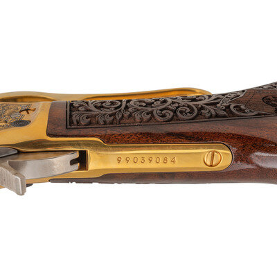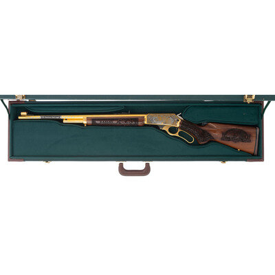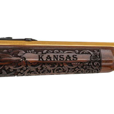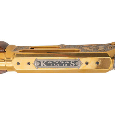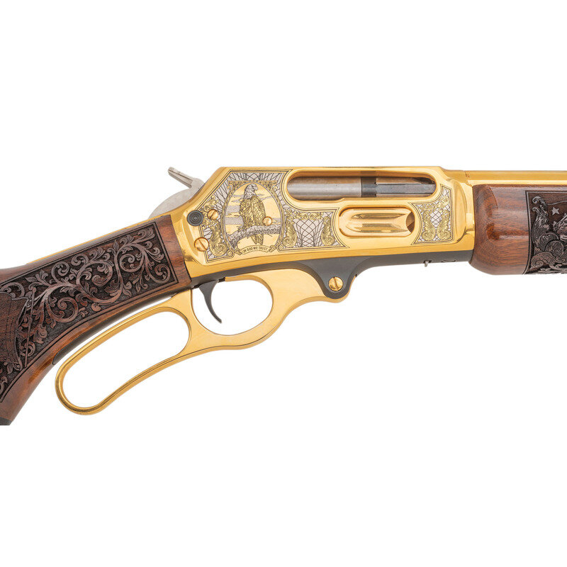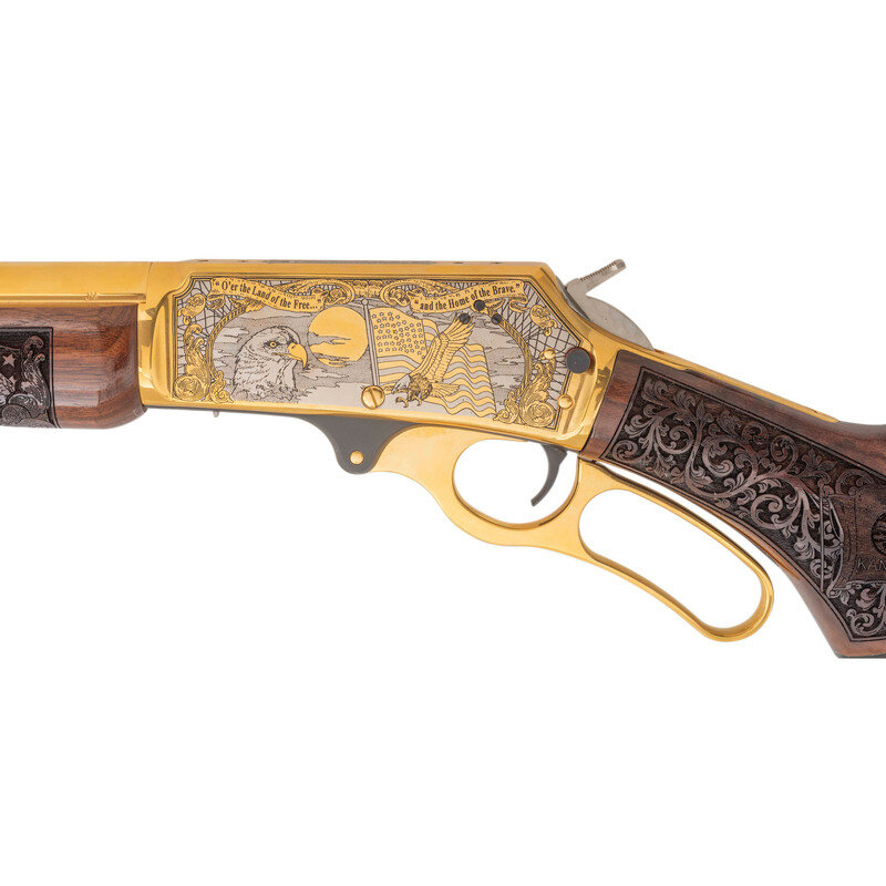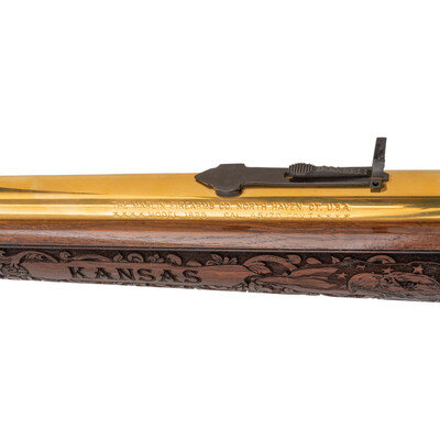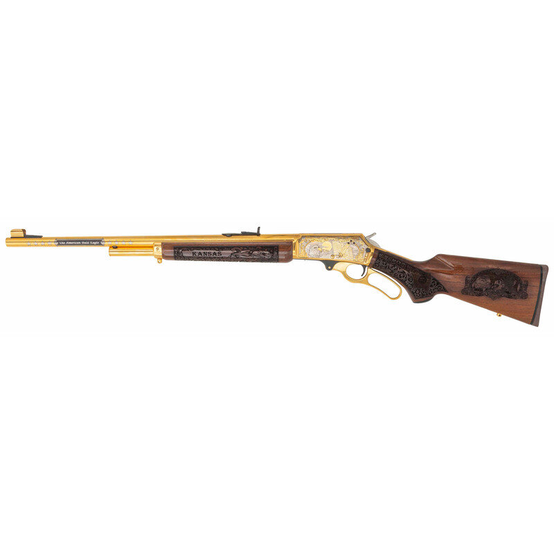 .45-70. 21.875" barrel length. SN: 99039084. Gold plated finish with jeweled bolt, richly engraved stock, and an engraved receiver commemorating the history of the State of Kansas. Lever action repeating rifle mounting walnut semi-pistol grip stock with rubber recoil pad, half length magazine tube, and fully hooded front brass bead sight paired with semi-Buckhorn rear notch. Standard Marlin markings to the barrel. Receiver is engraved with a bald eagle portrait followed by a bald eagle in flight in front of the American flag. Top of the receiver is drilled and tapped for optics mounting, and further marked KANSAS/4 OF 10. Left barrel is marked The American Bald Eagle with the right emblazoned A Tribute to Freedom. Stock is engraved with KANSAS in banners on forend, rich floral scroll, and Kansas flags to the wrist Butt further engraved with Bald Eagle seals on both sides. Comes in original INVESTMENT ARMS/INCORPORATED branded presentation case with green velvet lining and leather corners. {MODERN}