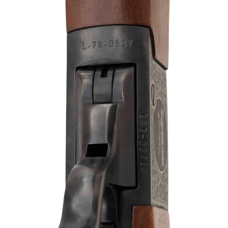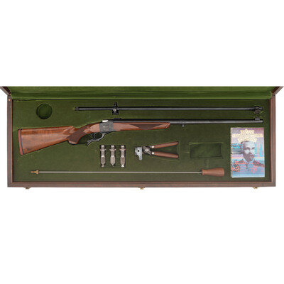 .45-70. 28" barrel length. SN: 131-32718. Blued finish in walnut-semi pistol grip stock with front and rear sling studs, rubber recoil pad, and mounting blocks for Unertl style scope. Single shot falling block rifle with tang safety commemorating the Centennial of Lyman. Rifle shows standard marks on arrel with the receiver flanks exhibiting floral engraving enclosing the Lyman logo on right and Lyman/1878-1978/CENTENNIAL/EDITION II. Item comes in its original presentation case with three reloading dies, cleaning rod, detachable sling loops, bullet mold, Centennial coin, and a Lyman produced Unertl style scope. Scope is missing the rear mounting screw. Additionally comes with the LYMAN CENTENNIAL JOURNAL. {MODERN}