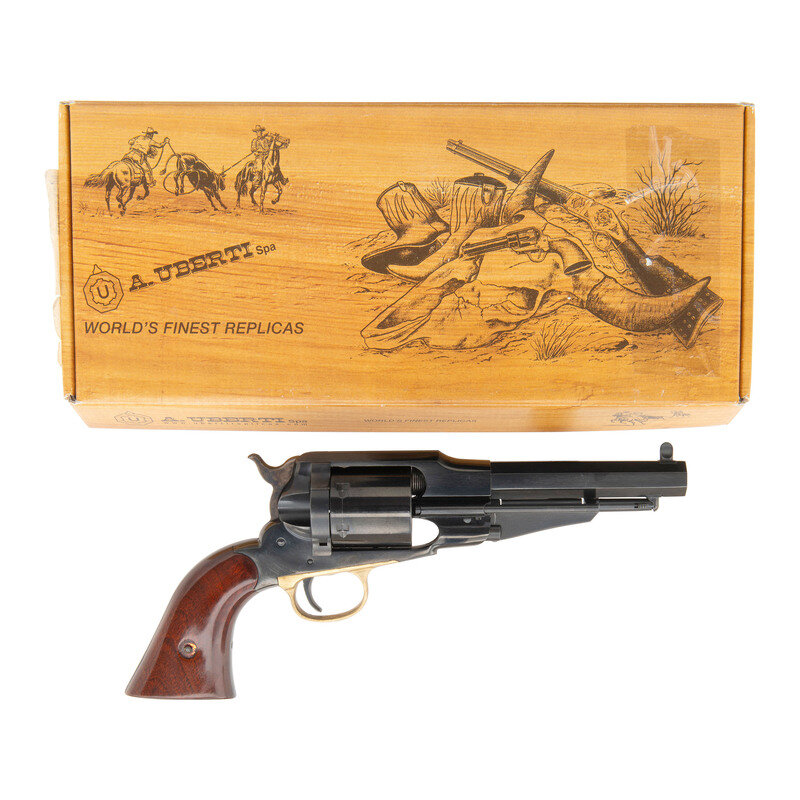 .45 Colt. 5.5" barrel length. SN: X12445. Blued metal finish with brass triggerguard, casehardened hammer, and varnished walnut two-piece grips. Single action six-shot loading gate revolver patterned after cartridge converted Remington New Model Army. Item features an octagonal barrel and dovetailed front blade with topstrap rear notch sights. Standard make and model markings including CIMARRON mark to the barrel and Italian smokeless powder firing proofs. Lower barrel struck with UBERTI maker marking. Comes with original cardboard box. {MODERN}