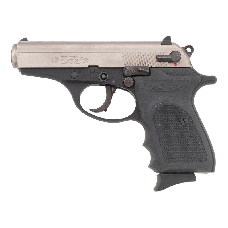 .380 ACP. 3.5" barrel length. SN: 877181. Matte stainless steel slide with black anodized alloy frame and black rubber FireStorm branded grip panels. Simple blowback operated DA/SA autoloading pistol fed by detachable single stack magazines. Item mounts fixed rear notch and front blade sights, and shows standard make and model markings overall. Comes with a total of five magazines, three Pro-Mag with synthetic followers, and two BERSA branded examples with steel followers. {MODERN}