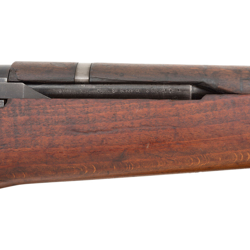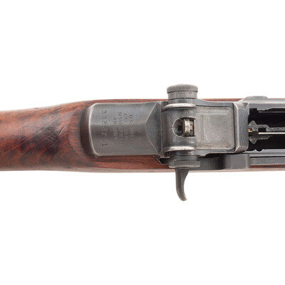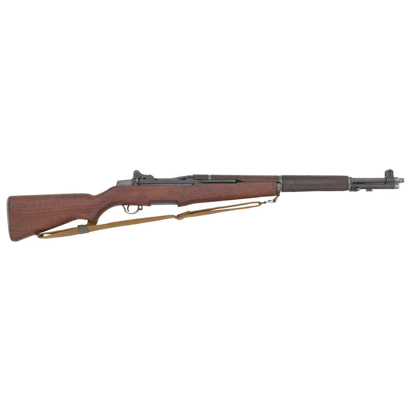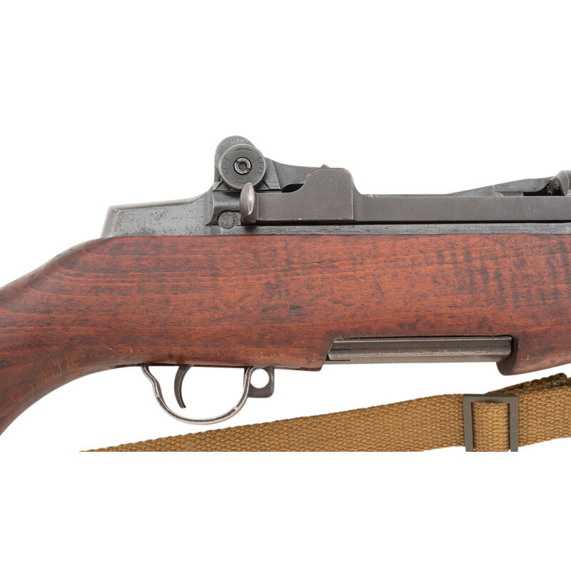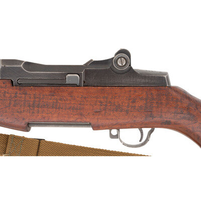 .30-06. 24" barrel length. SN: 3322711. Parkerized metal finish with walnut semi-pistol grip stock with replaced barrel dated 3-53, and T105 pattern rear aperture sight. Long-stroke piston driven gas operated rifle fed by an internal magazine charged with en bloc clips. Manufacturer marking to receiver reads U.S. RIFLE/CAL. .30 M1/SPRINGFIELD/ARMORY. Item shows Springfield Armory markings on the relief cut operating rod, bolt, hammer, trigger group, and lower receiver. Buttstock appears to have been aggressively sanded with rounded edges and no visible arsenal markings. Stock is void of tools. Mounts a reproduction canvas Nobukl pattern sling. {C&R}